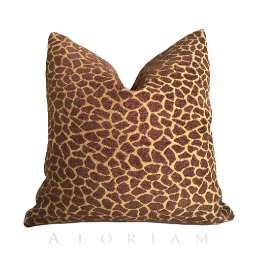 Last one! This stunning pillow cover is made from a giraffe pattern designer chenille fabric woven in rich brown and ochre tan. Pillows like this are commonly featured in celebrity and designer homes in magazines, now it's time to have your very own! Photographed on 17x17 cover (filled with 18x18 insert).