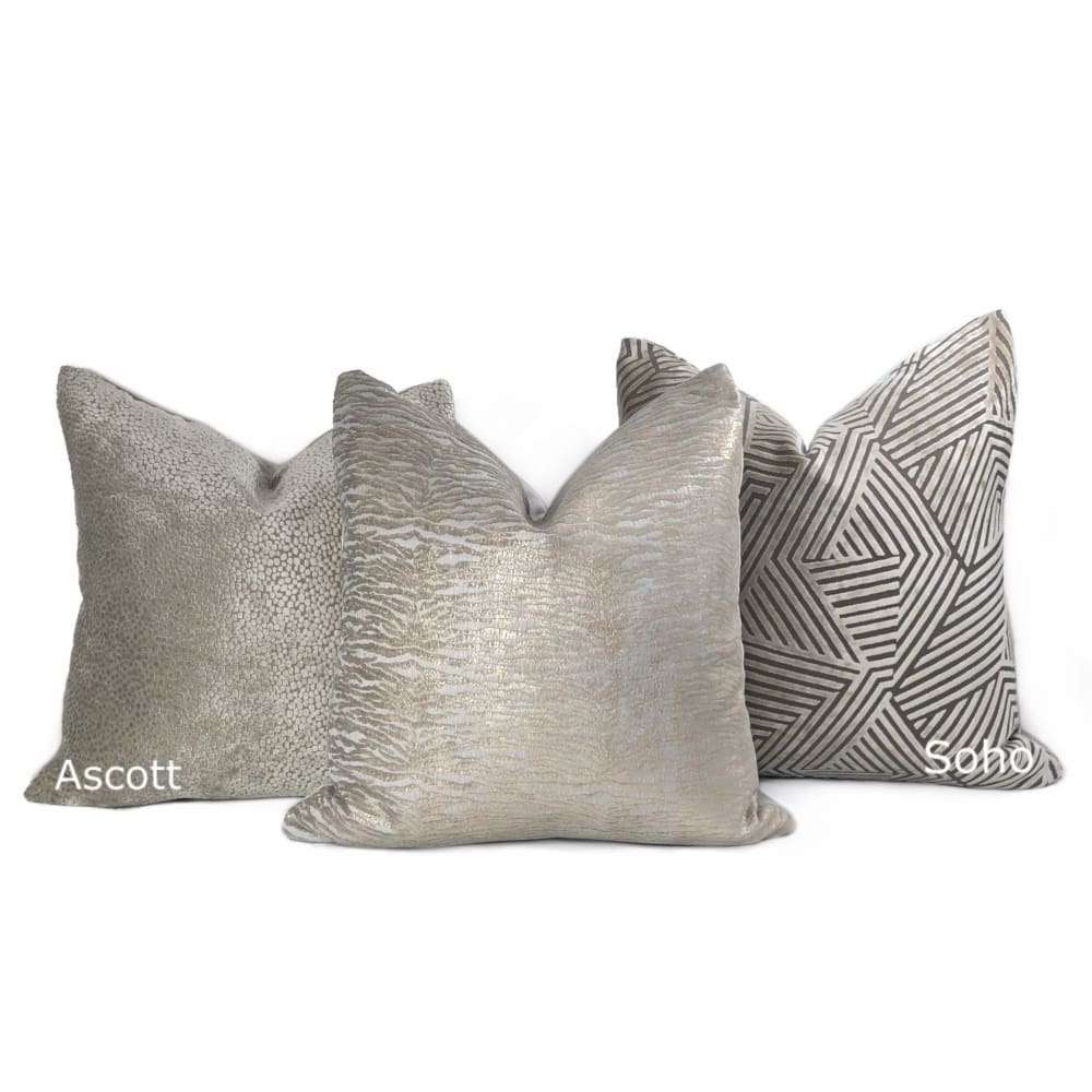 Woven in a lustrous warm gray velvet (gray with a hint of taupe) against a taupe background, this pillow cover is a beautiful mixer with many other designs. Pairs well with both warm grays and neutral browns.