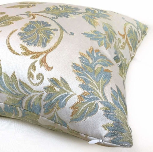 (CLEARANCE) Cream Gold Green Blue Brown Floral Botanical Pattern Pillow Cover