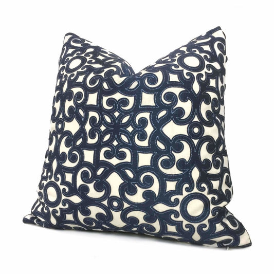(CLEARANCE) Dark Blue Cream Scrollwork Motif Applique Embroidered Pillow Cover