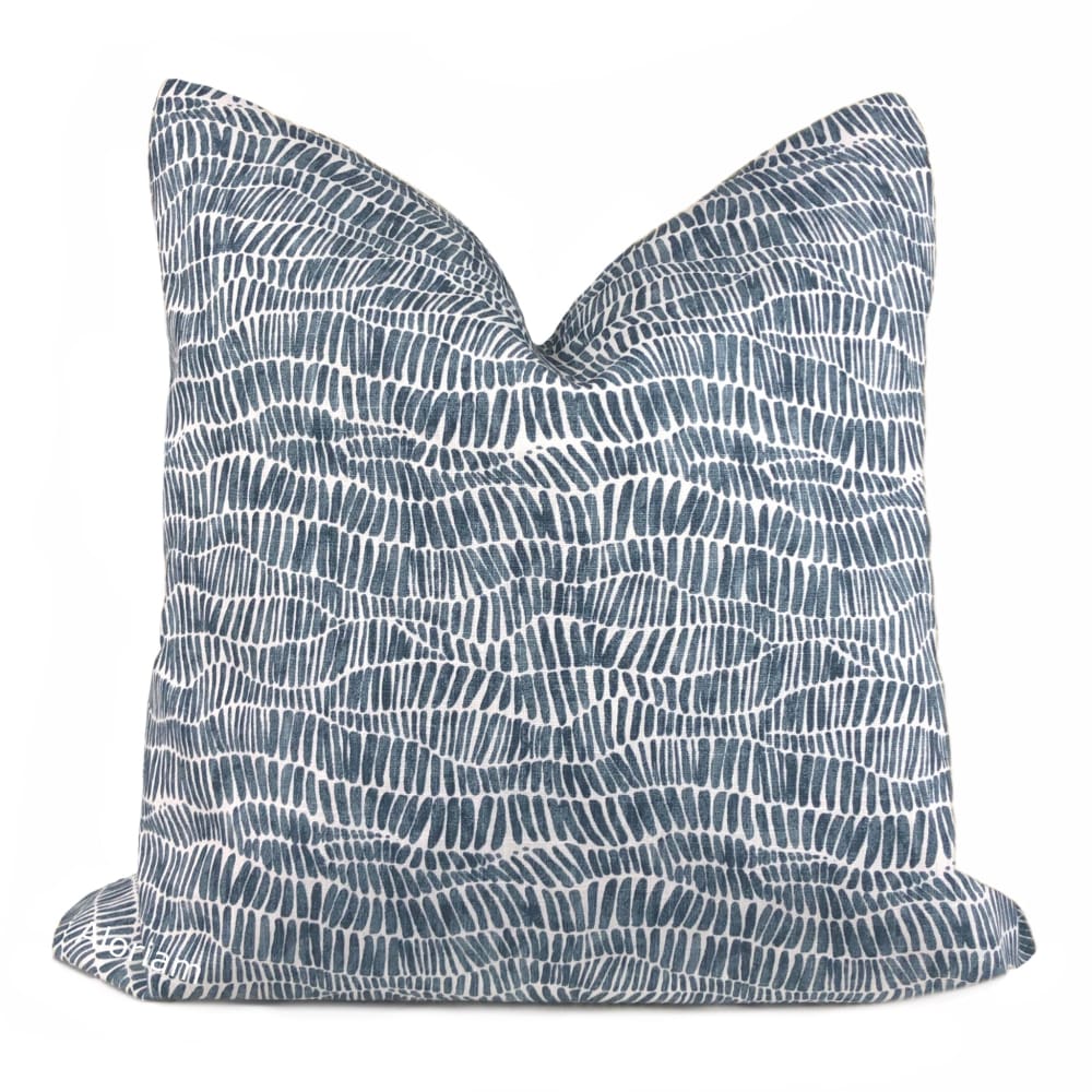 Anouk is a cotton pillow cover featuring a wavy abstract design printed in blue and white.