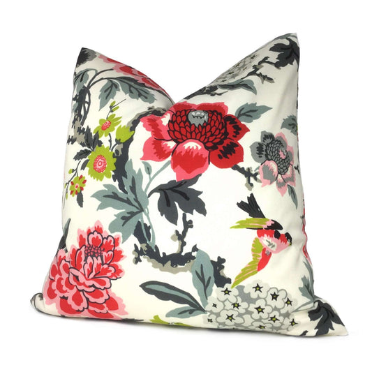 Chloe I Pink Gray Chartreuse Cream Floral Birds Cotton Print Pillow Cover