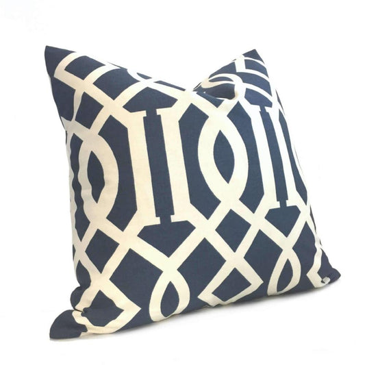 Designer Navy Blue Cream Trellis Lattice Cotton Print Pillow Cover