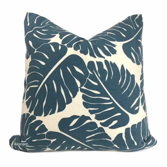 Martinique Dark Blue Modern Palm Leaf Print Pillow Cover