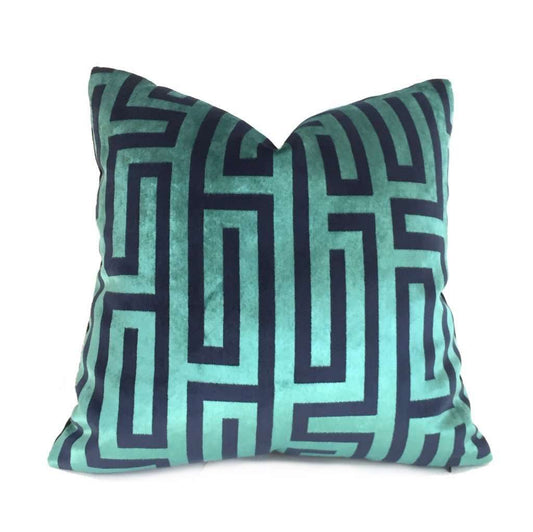 Kittredge Ogee Waves Turquoise Blue Cream Beige Cut Velvet Pillow Cover