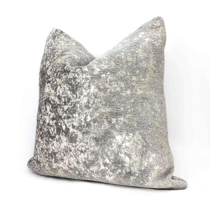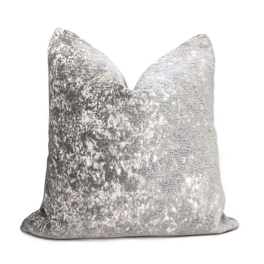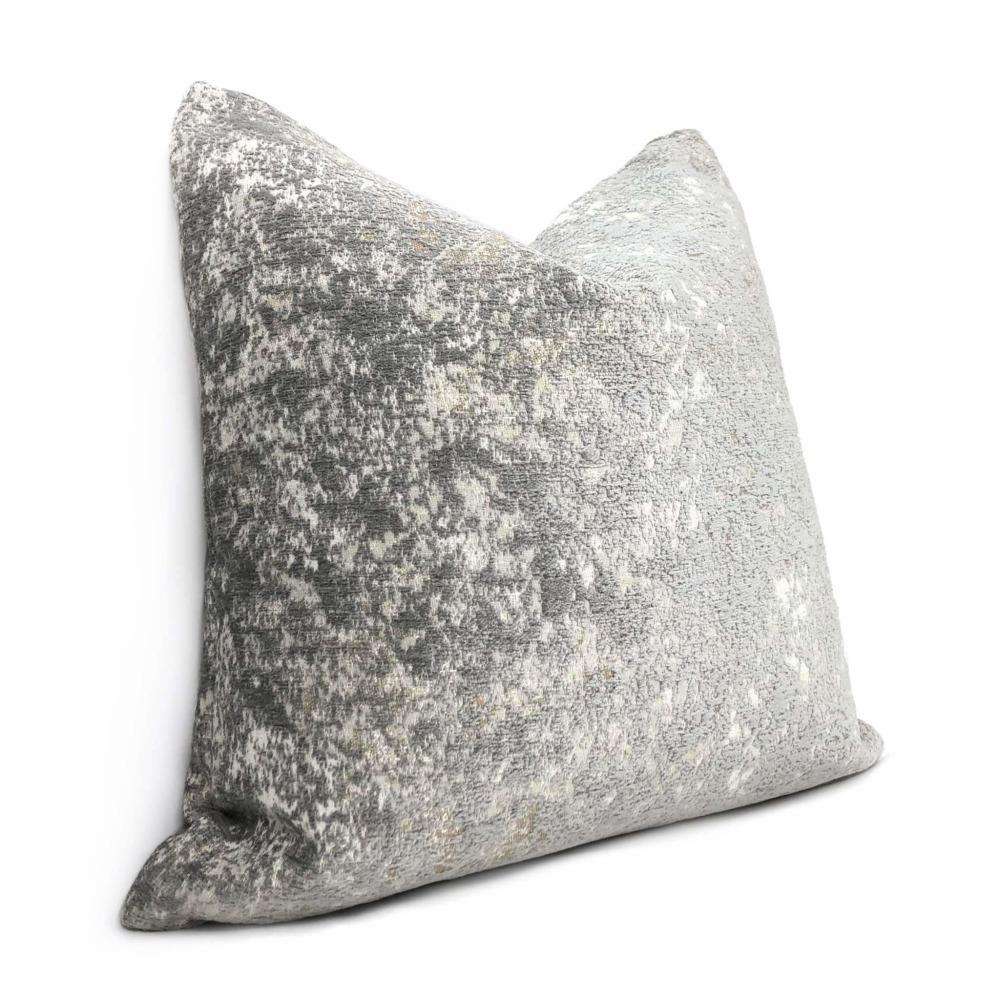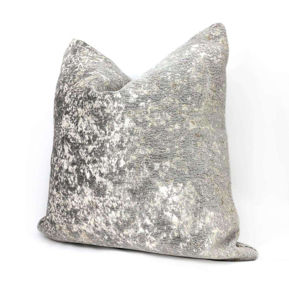 Almost sold out! Combining abstract texture with a soft hand, this plush pillow cover is belied by its rugged appearance. The designer chenille fabric is ultra thick (weighing in at well over 2 pounds a yard), and woven in dove gray shot through by subtle silver that shifts from light to dark from different viewing angles.