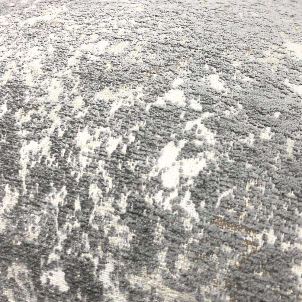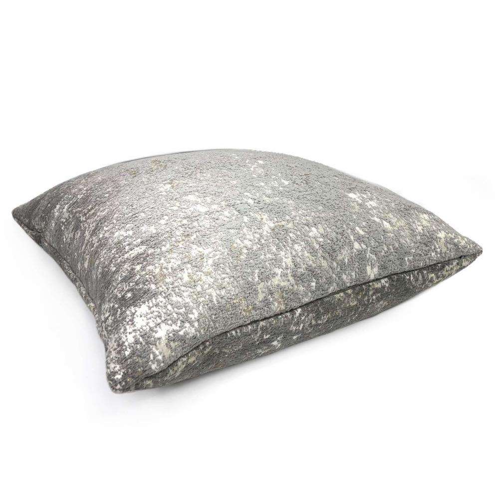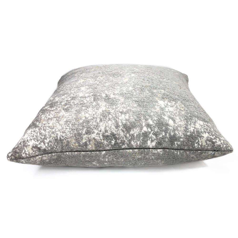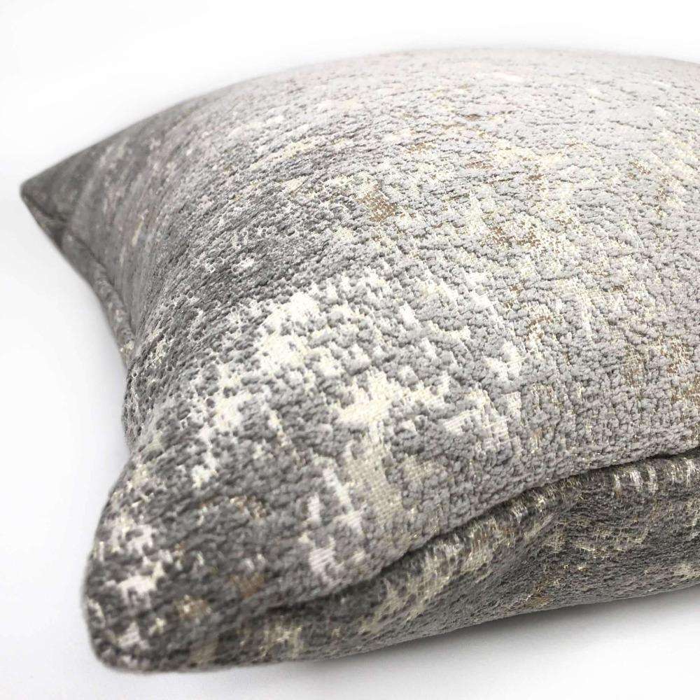 Almost sold out! Combining abstract texture with a soft hand, this plush pillow cover is belied by its rugged appearance. The designer chenille fabric is ultra thick (weighing in at well over 2 pounds a yard), and woven in dove gray shot through by subtle silver that shifts from light to dark from different viewing angles.