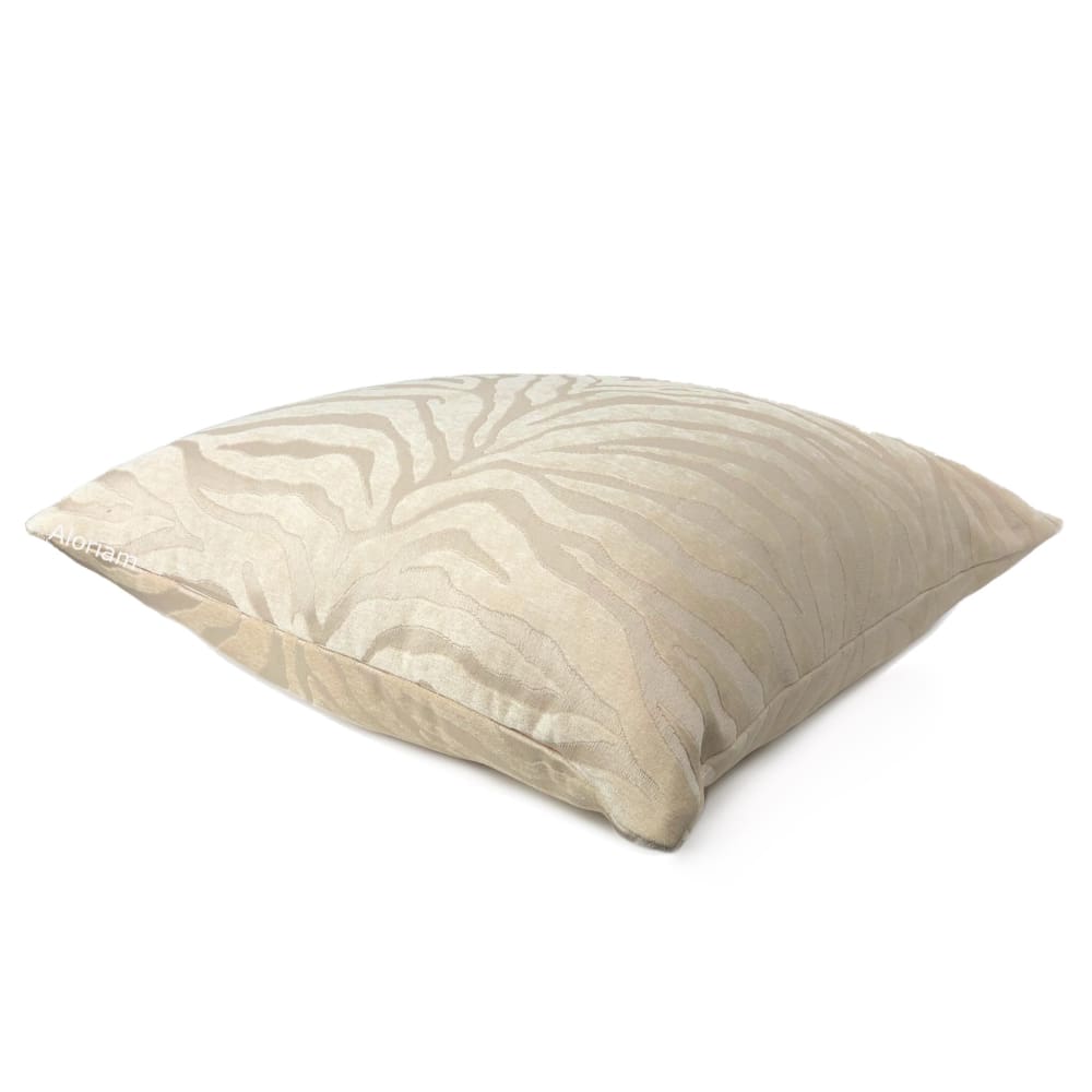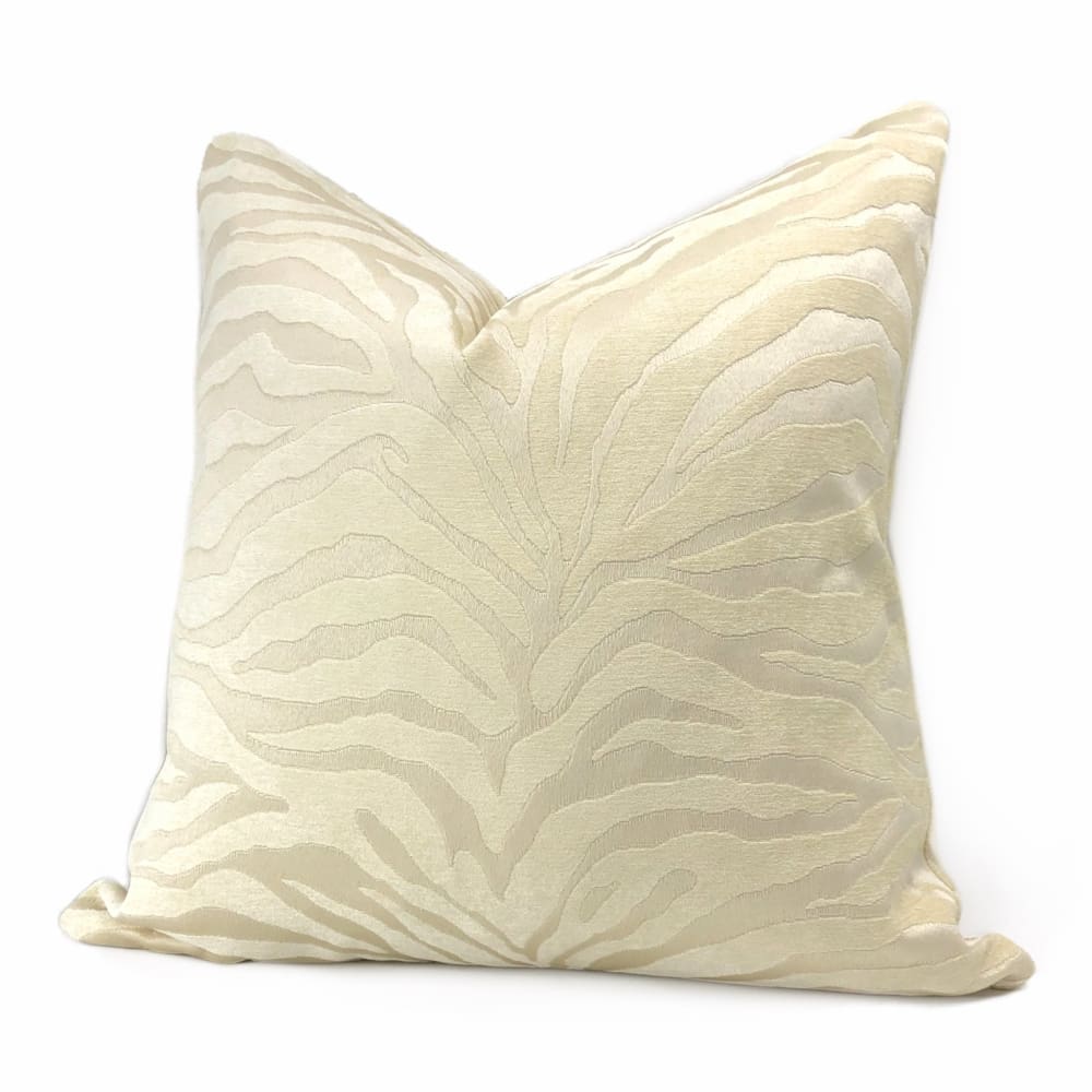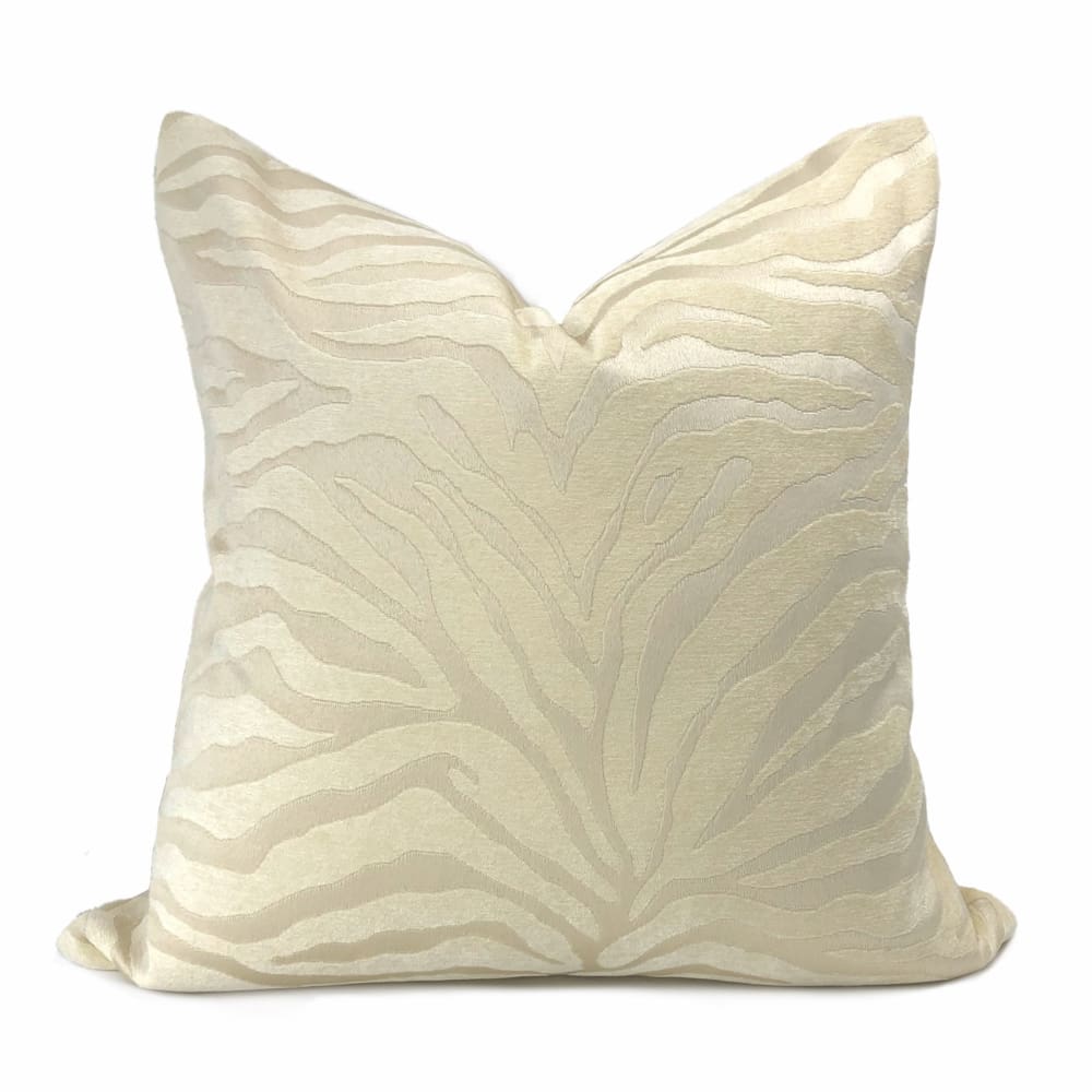 Limited availability! This pillow cover is made from a designer upholstery fabric featuring a two-tone cream and ivory colored animal tiger stripe pattern. The stripes have contrasting fuzzy and sateen textures with a wonderful dimensional quality.