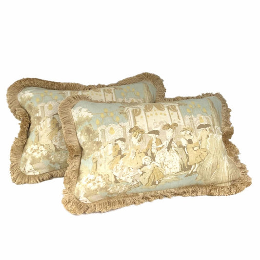 Bosporus Spa Blue Cream Old World Scenic Landscape Toile Pillow Cover with Brush Fringe Trim