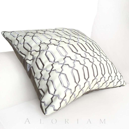 Elysa Gray & Cream Embroidered Lattice Fretwork Pillow Cover
