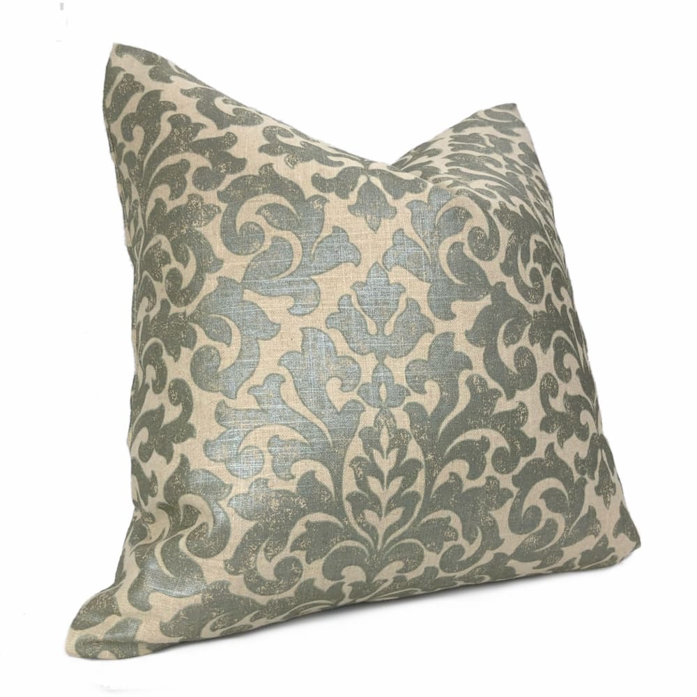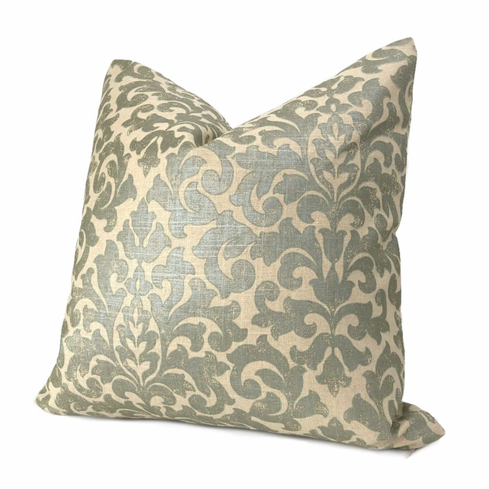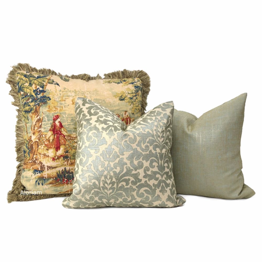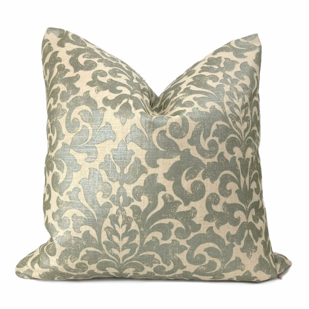 Gainsborough II Sage Green Beige Baroque Floral Damask Fringed Pillow Cover (Fabric by the Yard available)