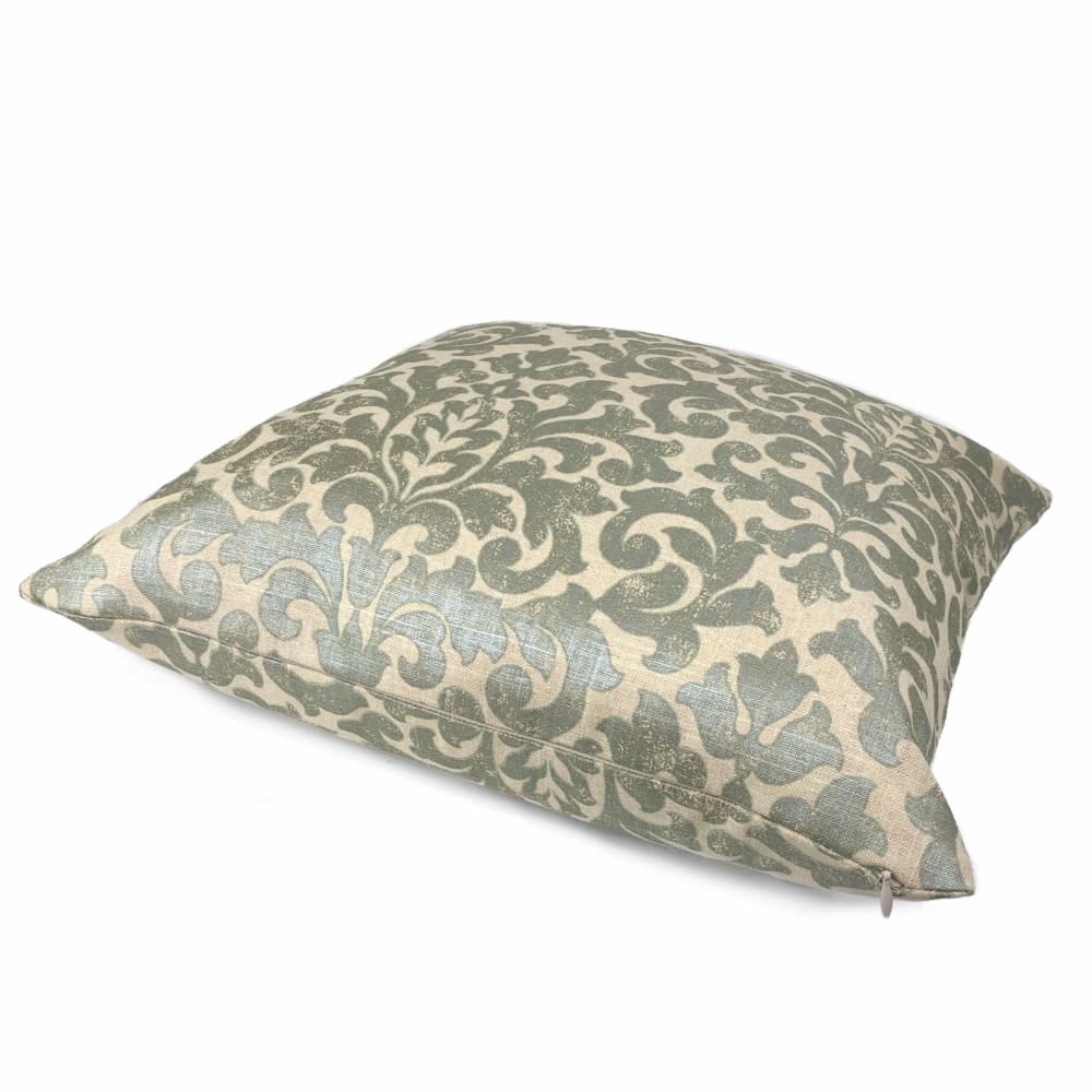 The Gainsborough II pillow cover features a graceful floral damask design printed in a lustrous sage green on a natural beige background.