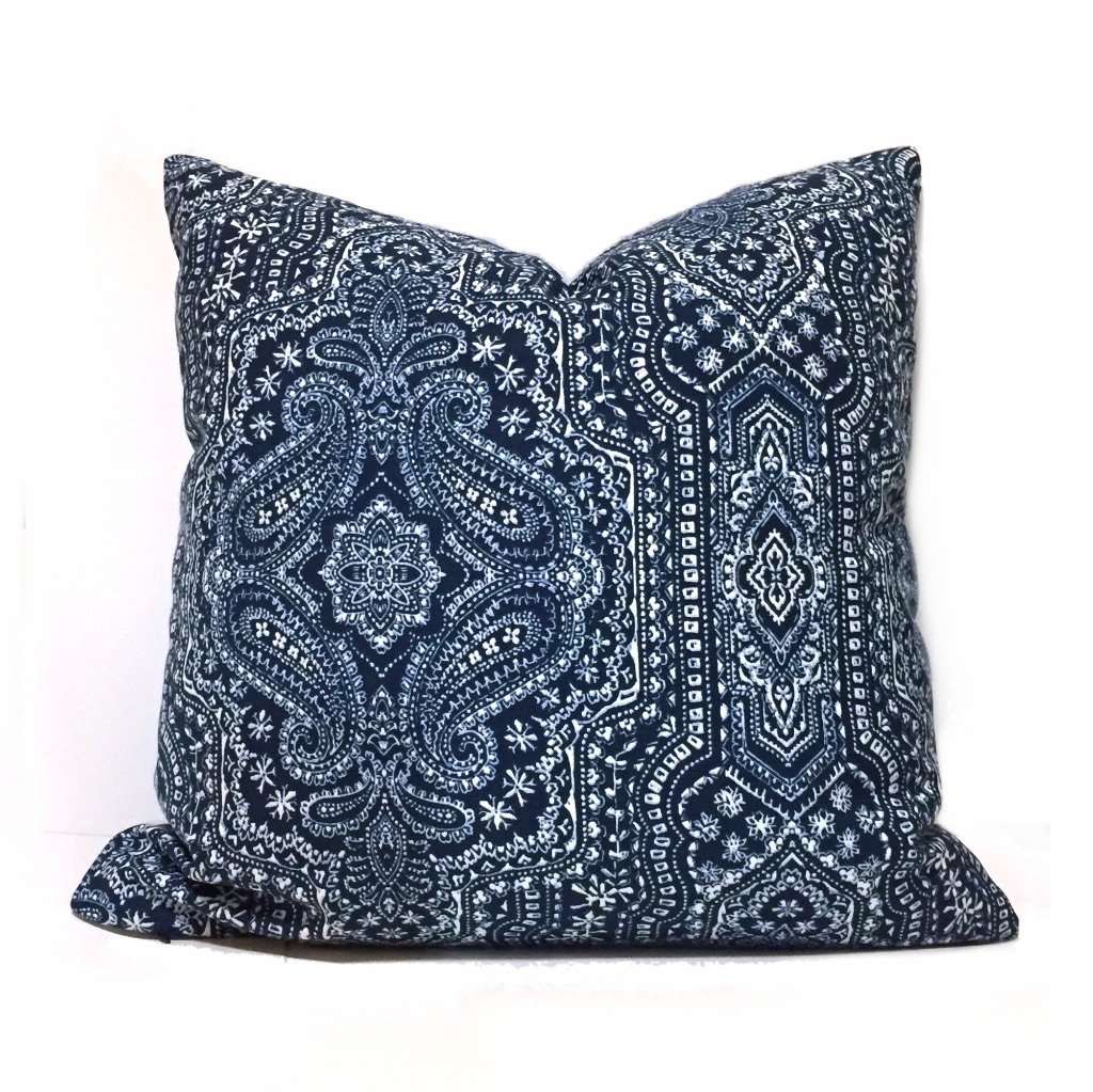 Last one! This navy blue and white pillow cover featuring an intricate paisley design is a beautiful addition to your home! Screen printed on home decor drapery weight cotton with a soil and stain resistant finish. Pattern fabric is used on both sides. Pictured on 20x20 and 14x20 inserts.