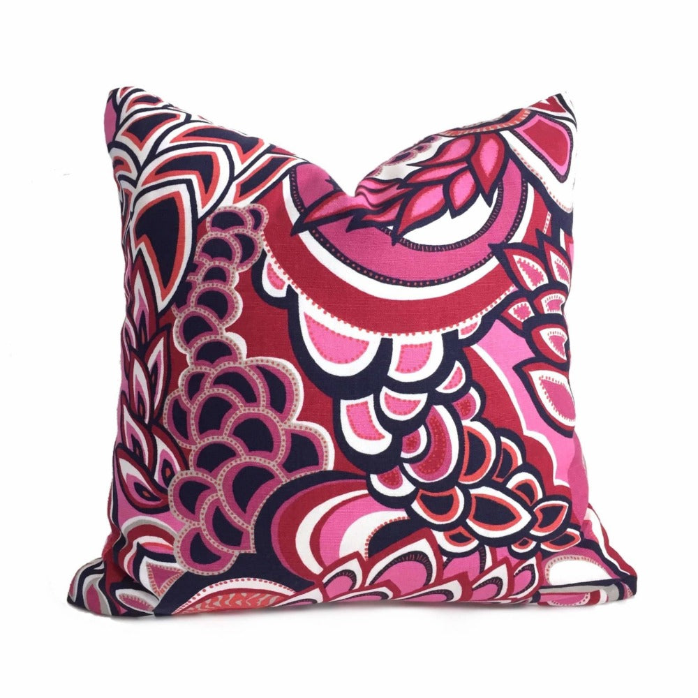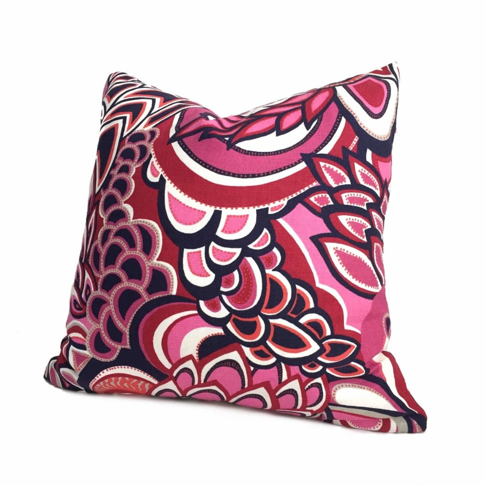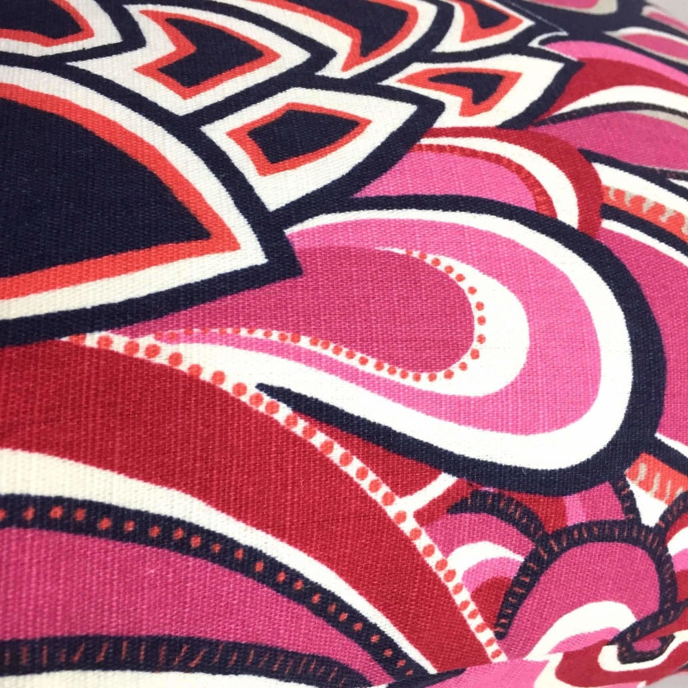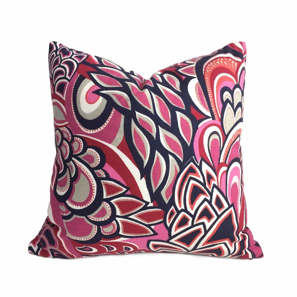 This retro mod floral pillow cover made from a fabric by designer Eileen Boyd is a fun and colorful addition to any decor. Colors include pink, navy blue, orange and white.