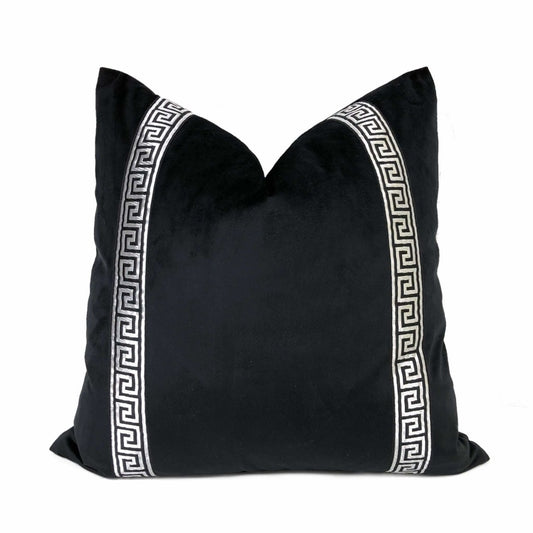Black Libretto Velvet Pillow Cover with Metallic Silver Greek Key Trim