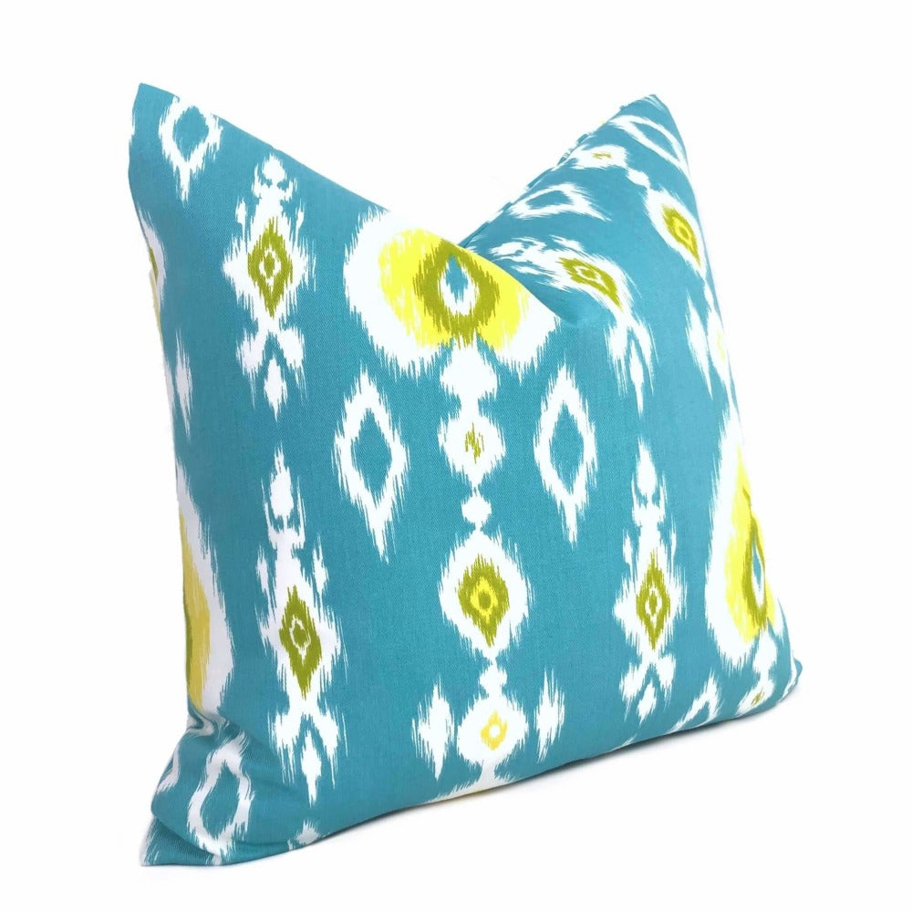 Bright and cheerful, this Ikat pillow cover rocks a global ethnic vibe in turquoise blue with white and yellow accents.
