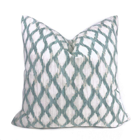 Meera Aqua Seaglass Green White Ikat Trellis Pillow Cover