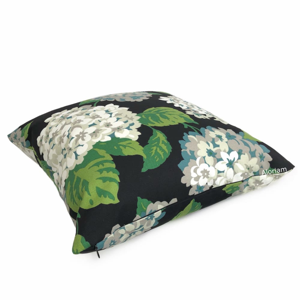 Bella is a beautiful floral pillow cover featuring hydrangea blooms printed in warm gray and cream with teal accents. Surrounded by lush green leaves, the flowers are contrasted against an onyx black background that really makes them pop! Pattern home decor cotton fabric on both sides. Photographed on 18x18 inserts.