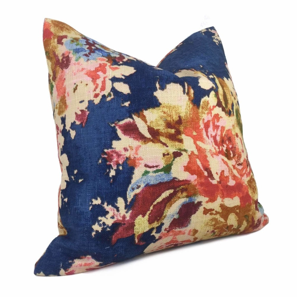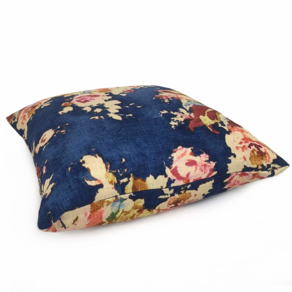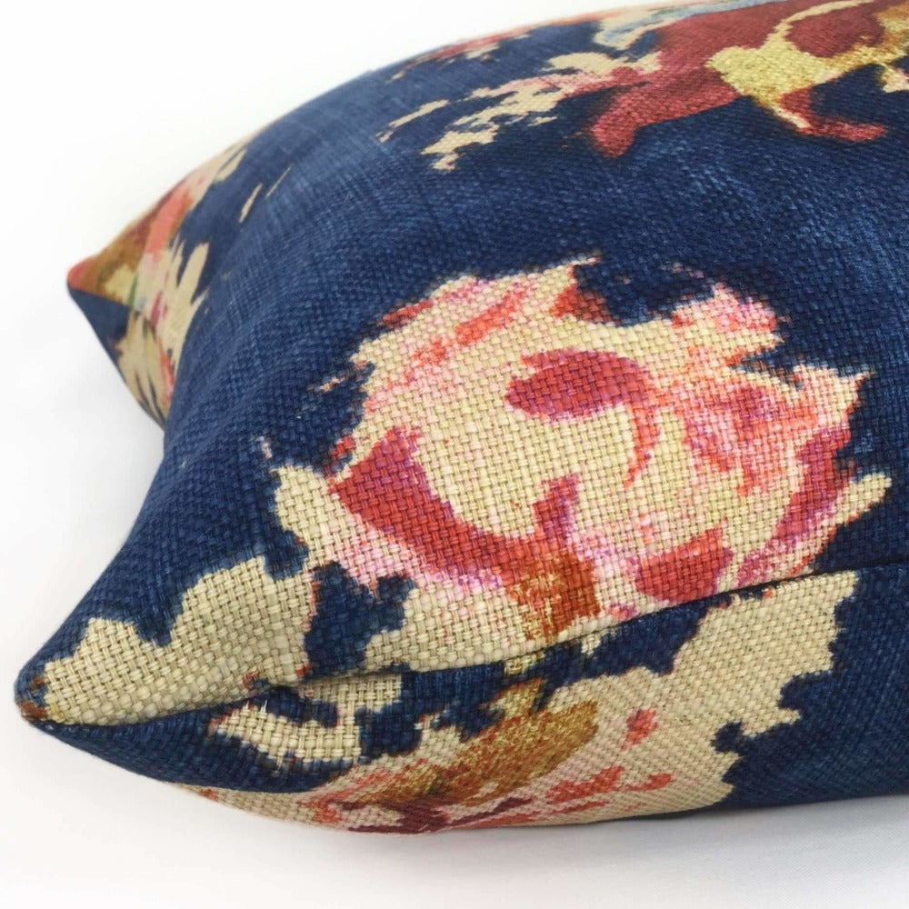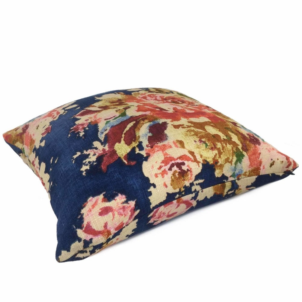 This voluptuous floral pillow cover will do Aphrodite, the Greek goddess of love, proud! The large blooms are printed in vibrant colors of pink, ochre and magenta on a dark blue background.