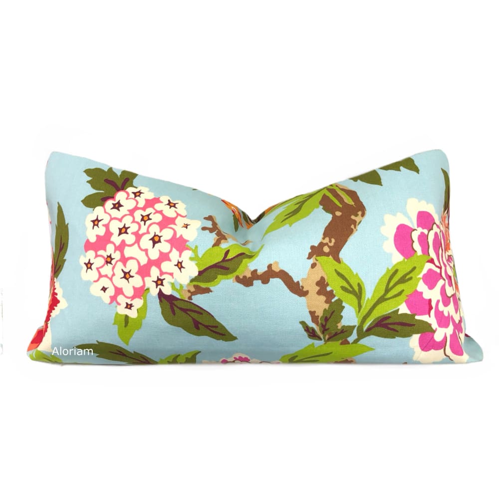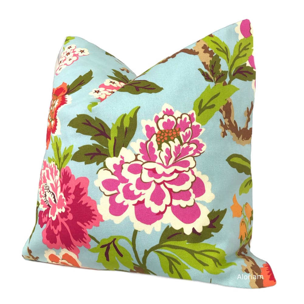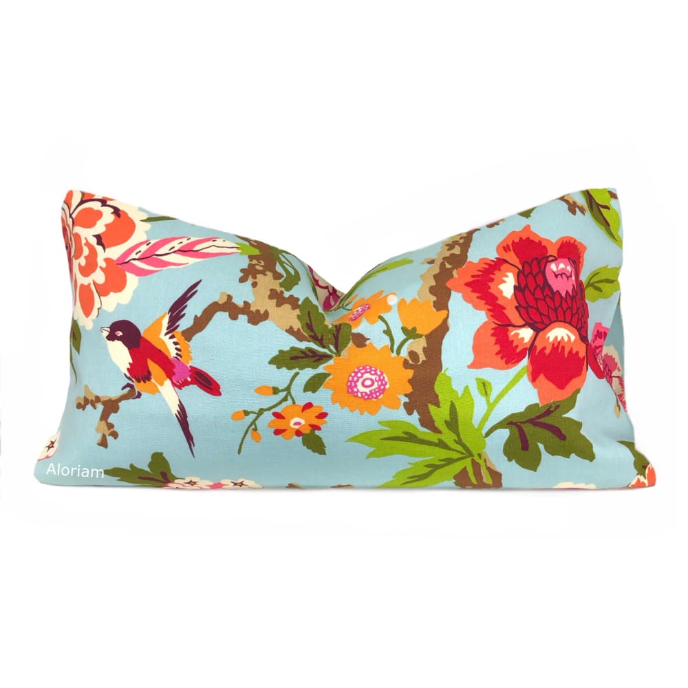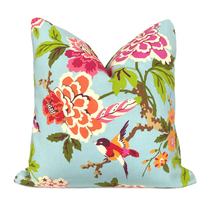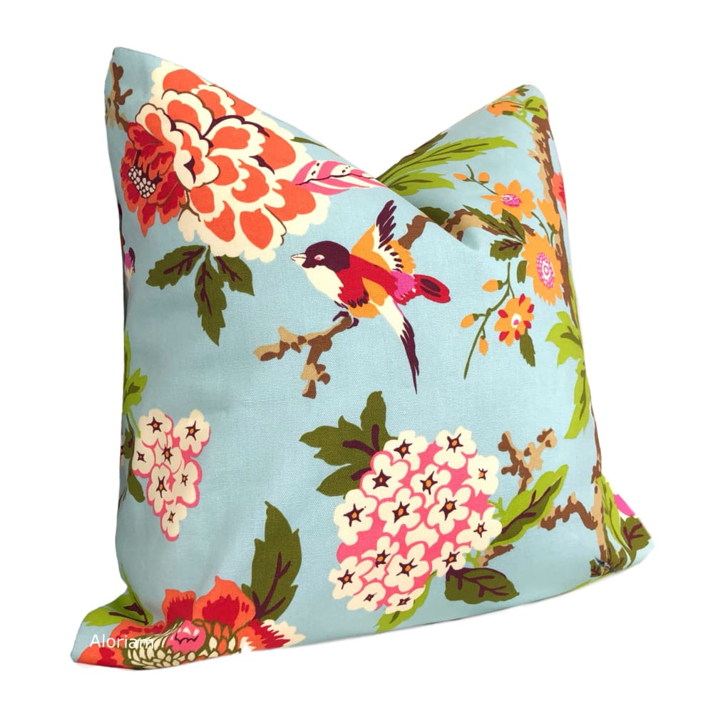 Chloe III Blue Orange Pink Green Floral Birds Print Pillow Cover