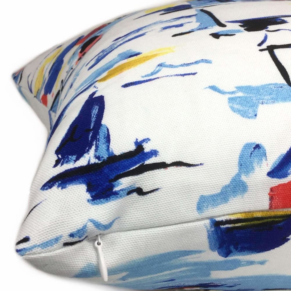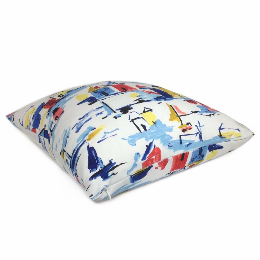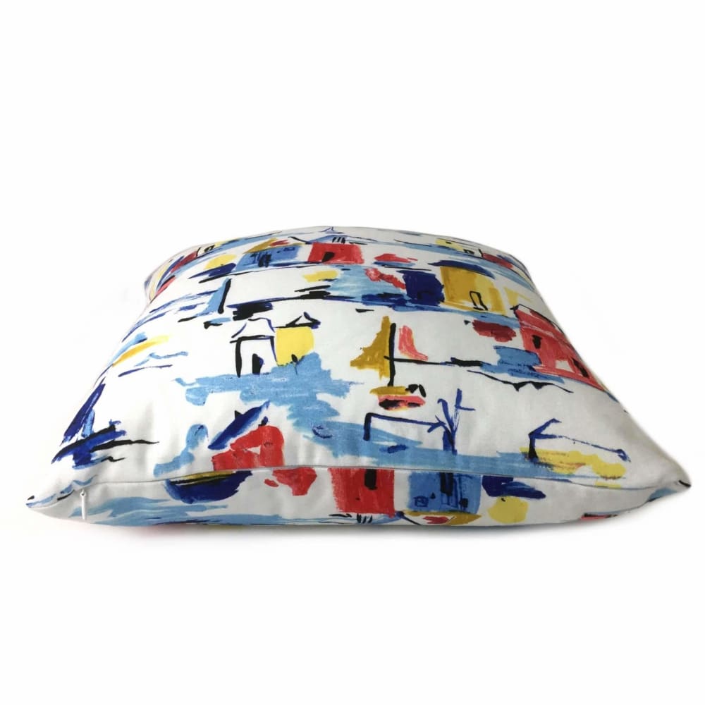 Last two! If you can't sail to the Mediterranean, let the Greek isles come to you! This scenic pillow cover features a modern artist rendition of the Greek islands, replete with charming buildings printed in primary colors of red, blue and yellow, on an ocean dotted with sailboats. Pattern fabric is used on both sides. Photographed on 17x17 cover (filled with 18x18 insert).