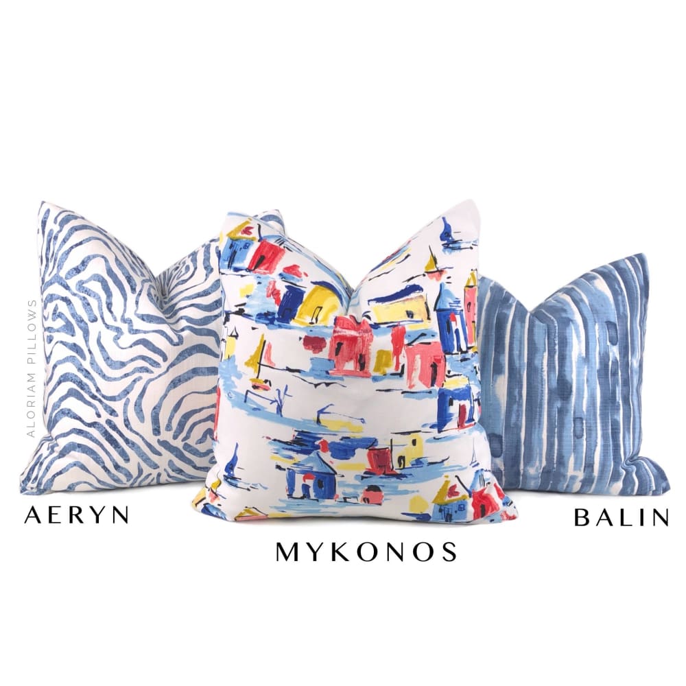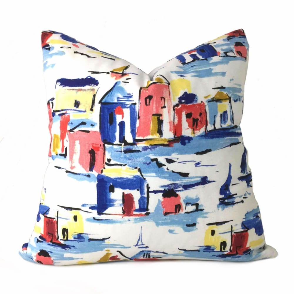 Mykonos Greek Islands Blue Red Yellow White Cotton Print Pillow Cover
