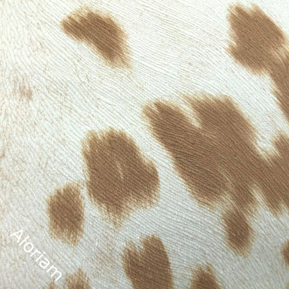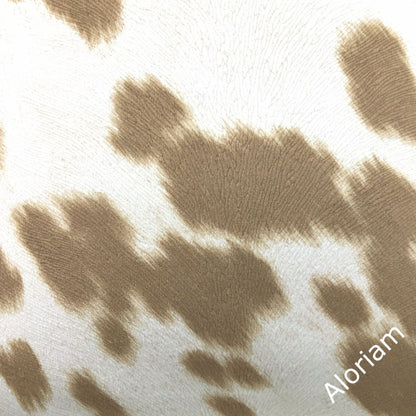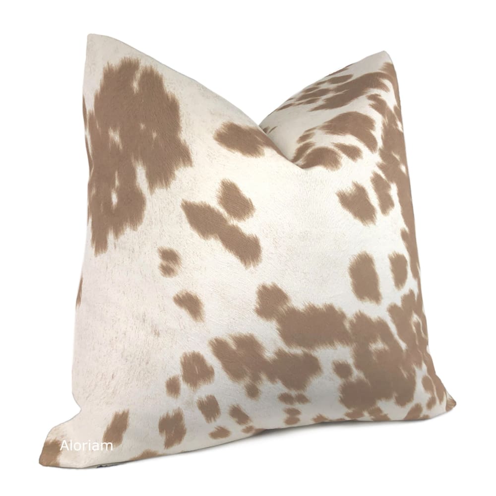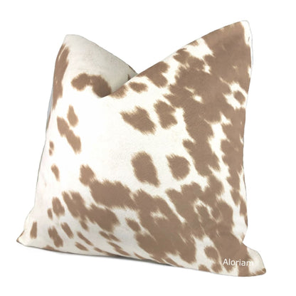 This stunning pillow cover is made from a faux cowhide fabric with a soft buttery suede-like hand in colors of medium brown and light cream.