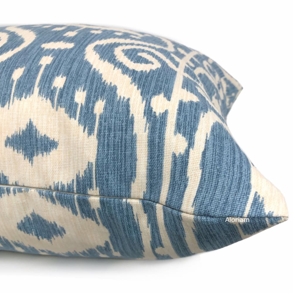 Kubla is a blue and cream colored cotton print pillow cover featuring an ikat design. A perfect addition to any contemporary interior! Pattern fabric on both sides. Photographed on 19x19 cover (filled with 20x20 insert).