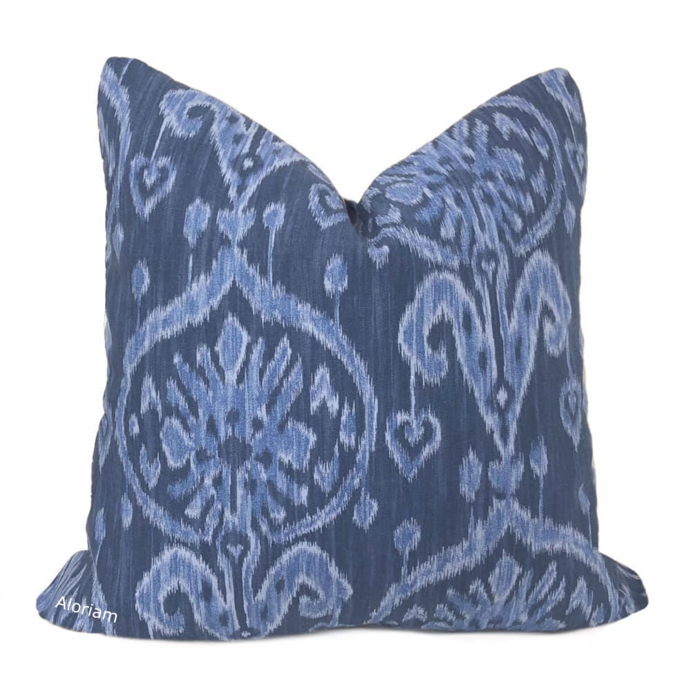 Malik is a cotton pillow cover featuring a large scale ikat design printed in shades of blue.