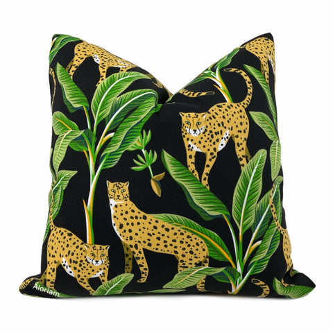 Jenga Leopards with Green Foliage Black Indoor Outdoor Pillow Cover