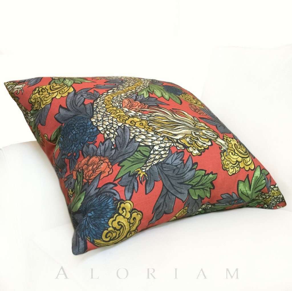 Sewn in a stunning Robert Allen chinoiserie print of a large scale dragon spread across botanical foliage background, this eye catching pillow cover features colors of terracotta orange, golden yellow, grey, green and navy blue. Photographed on 24" insert.
