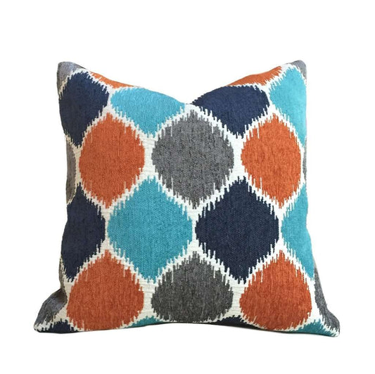 (CLEARANCE) Navy Blue Gray Turquoise Orange Geometric Chenille Pillow Cover