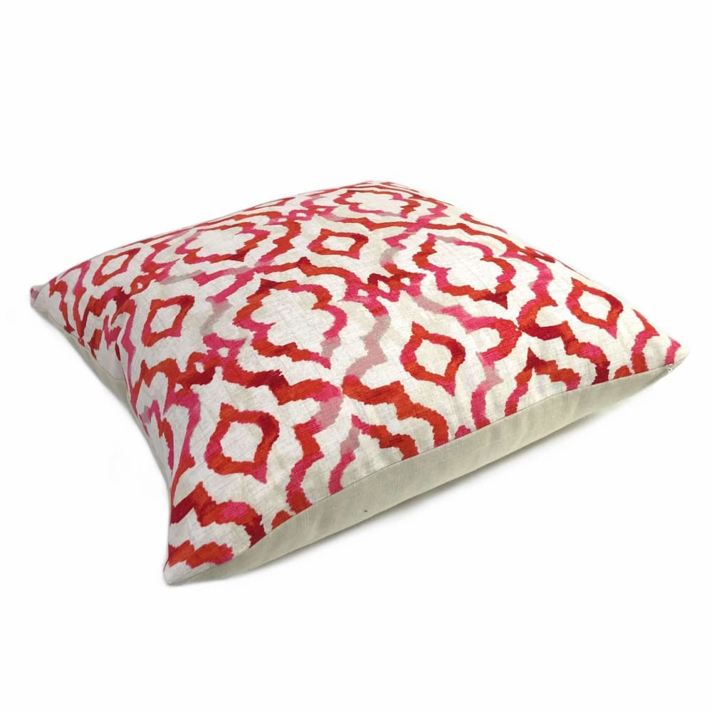 Fresh and bright, this pillow cover features a Moroccan style tile lattice pattern printed in pink and red on a light neutral beige background.