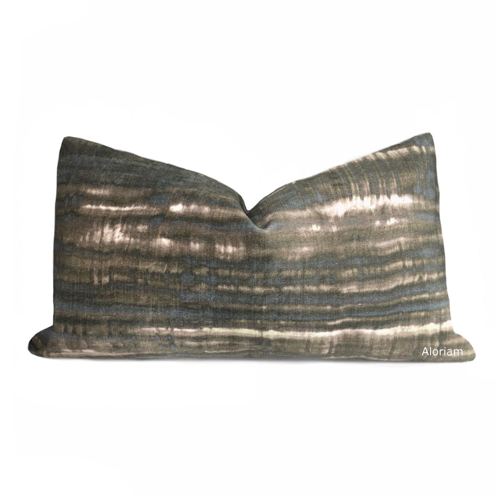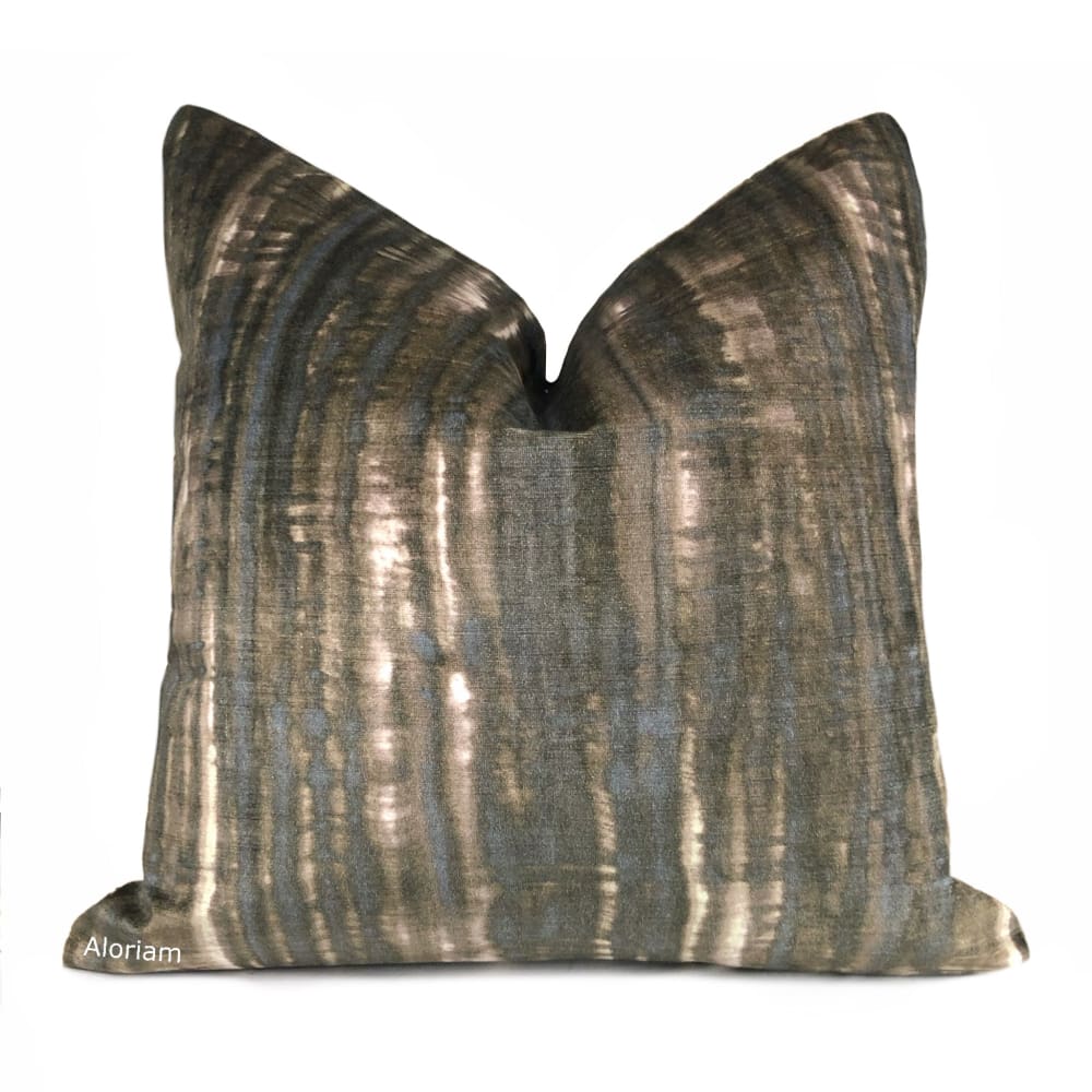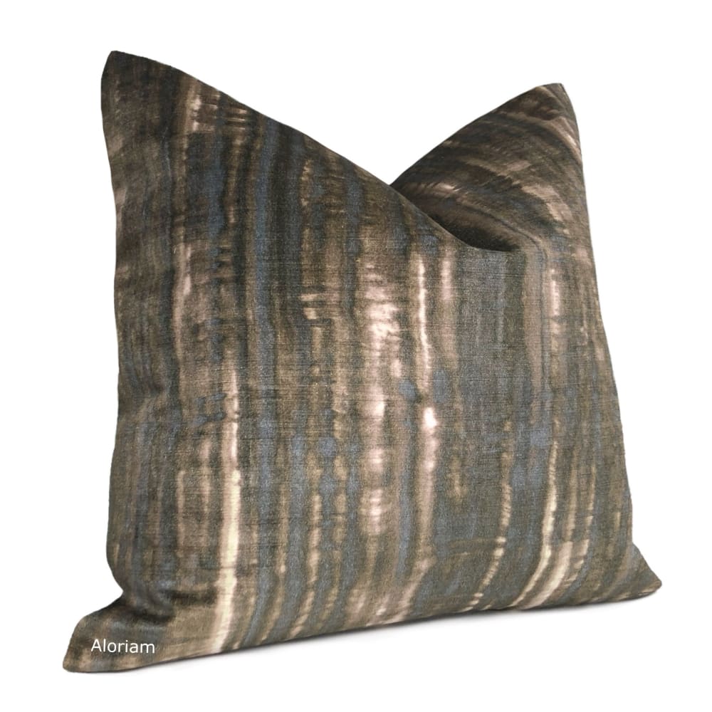 Dante is a modern velvet pillow cover with a painterly abstract stripe pattern woven in brown and slate blue-gray with off-white accents.
