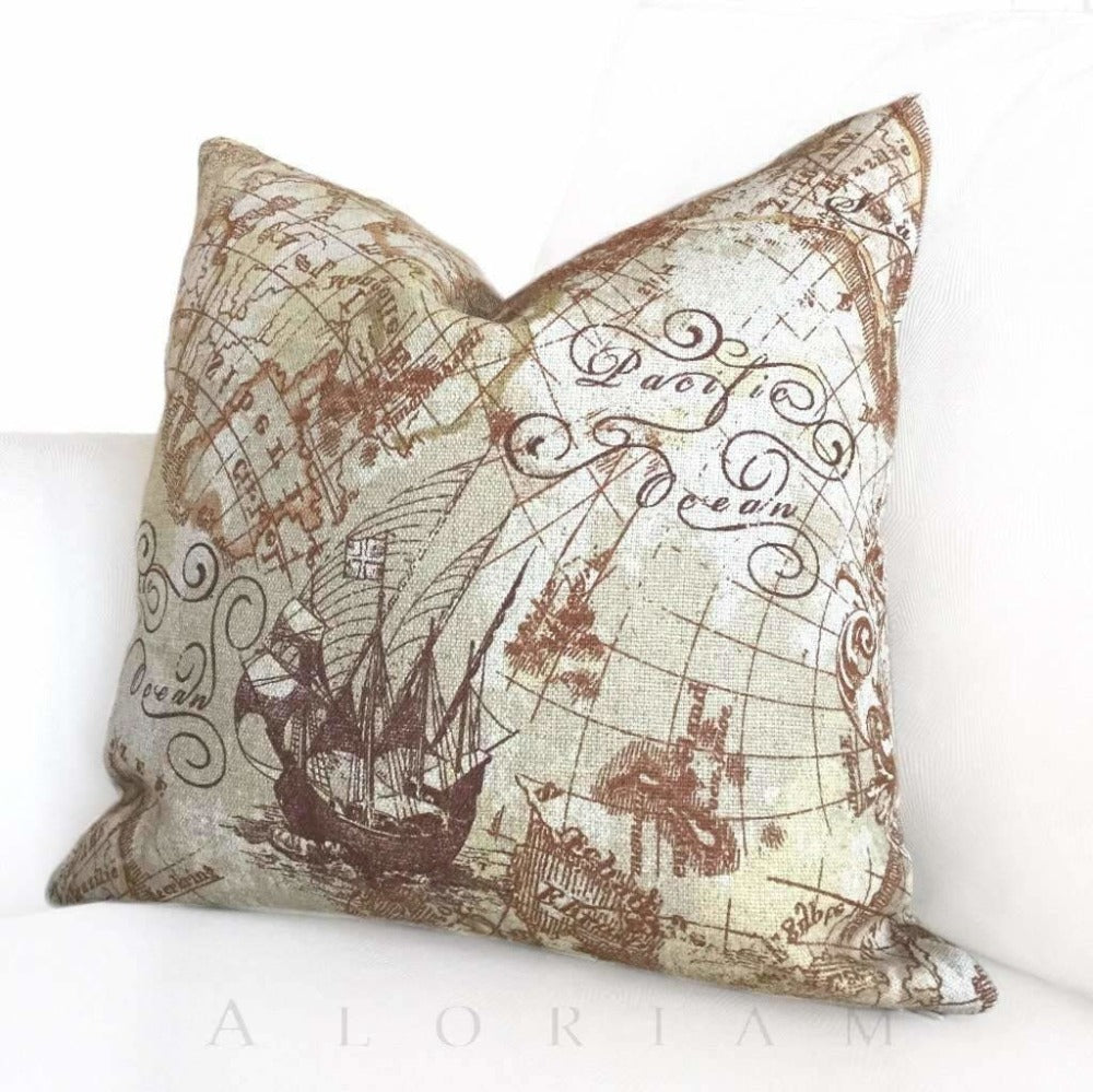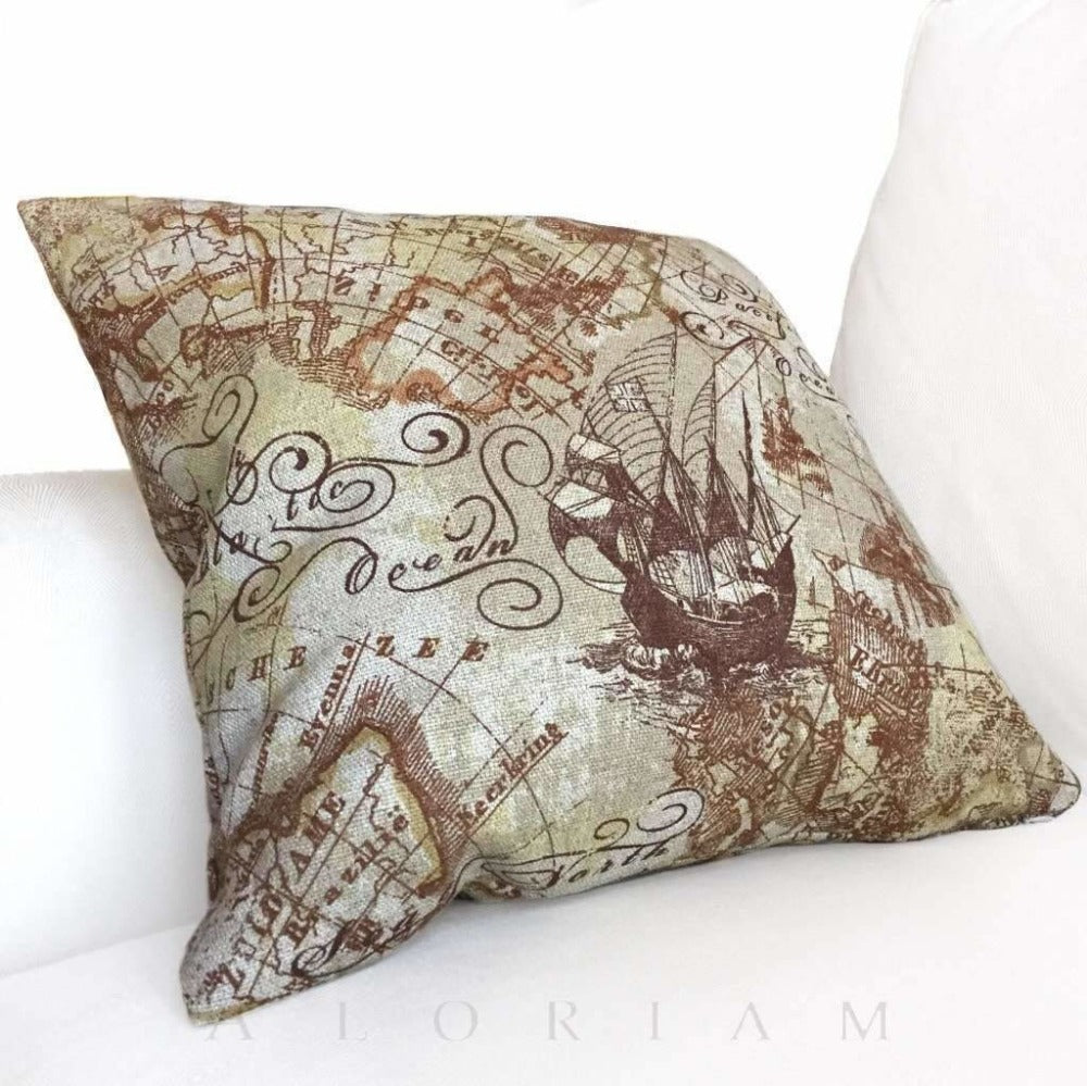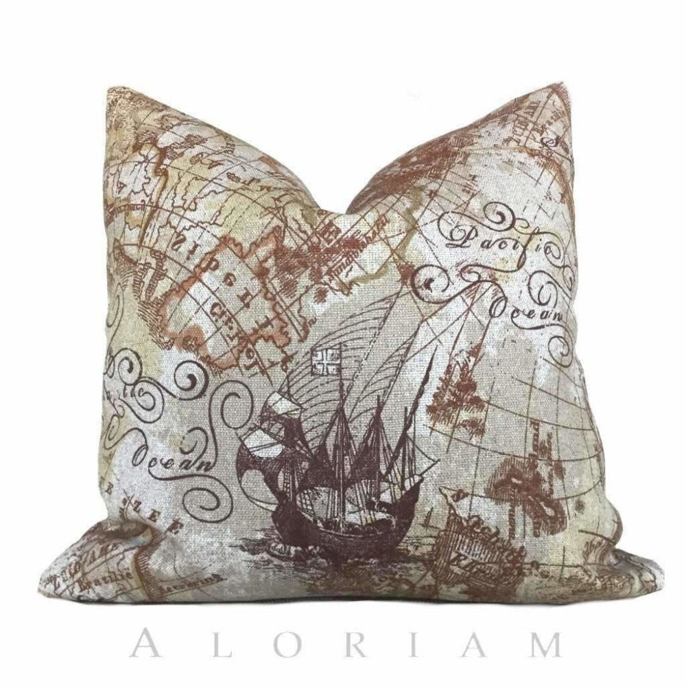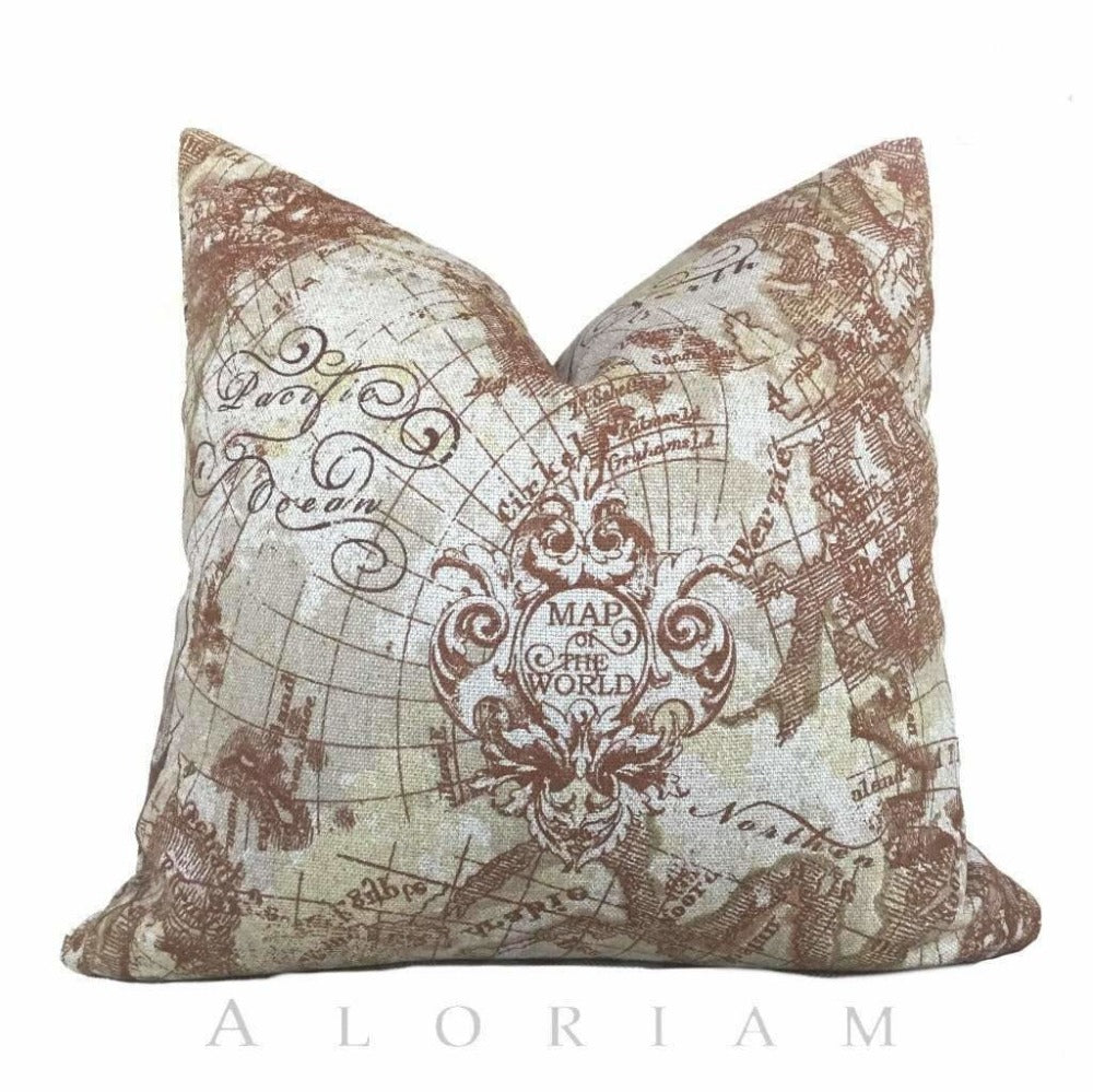 Almost sold out! Magellan is a charming antique world map print pillow cover printed in sienna brown on a light oatmeal beige background. A perfect choice for libraries, reading nooks, study rooms and more!