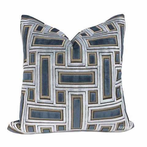 Magnus Blue & Silver Geometric Blocks Cut Velvet Pillow Cover
