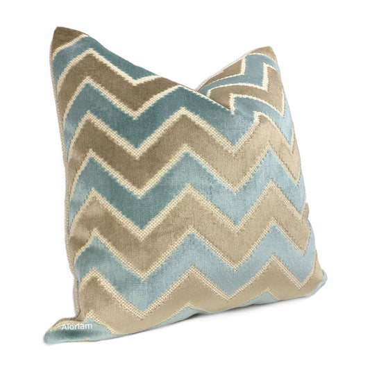 Malibu Robins Egg Blue & Taupe Beige Velvet Chevron Pillow Cover