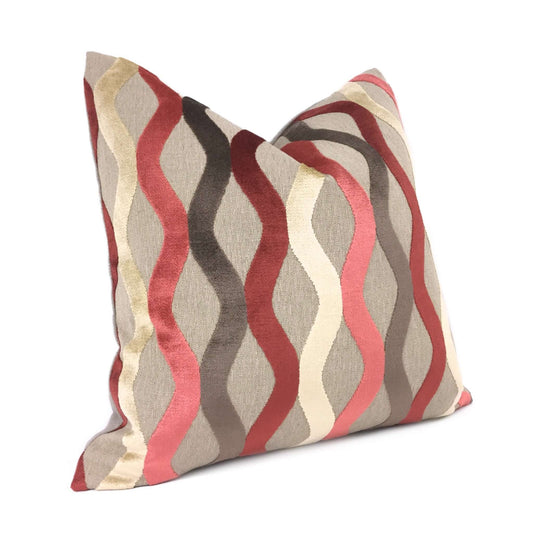 Marion Coral Rust Cream Beige Velvet Wave Stripes Pillow Cover