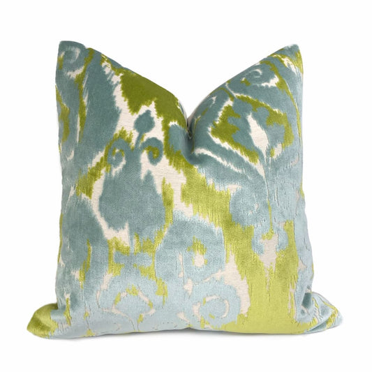 Robert Allen Velvet Bliss Ikat Damask Green Blue Cut Velvet Pillow Cover