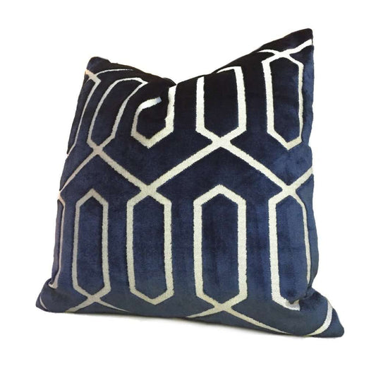 Robert Allen Bengal Lattice Geometric Midnight Navy Blue Italian Cut Velvet Pillow Cover
