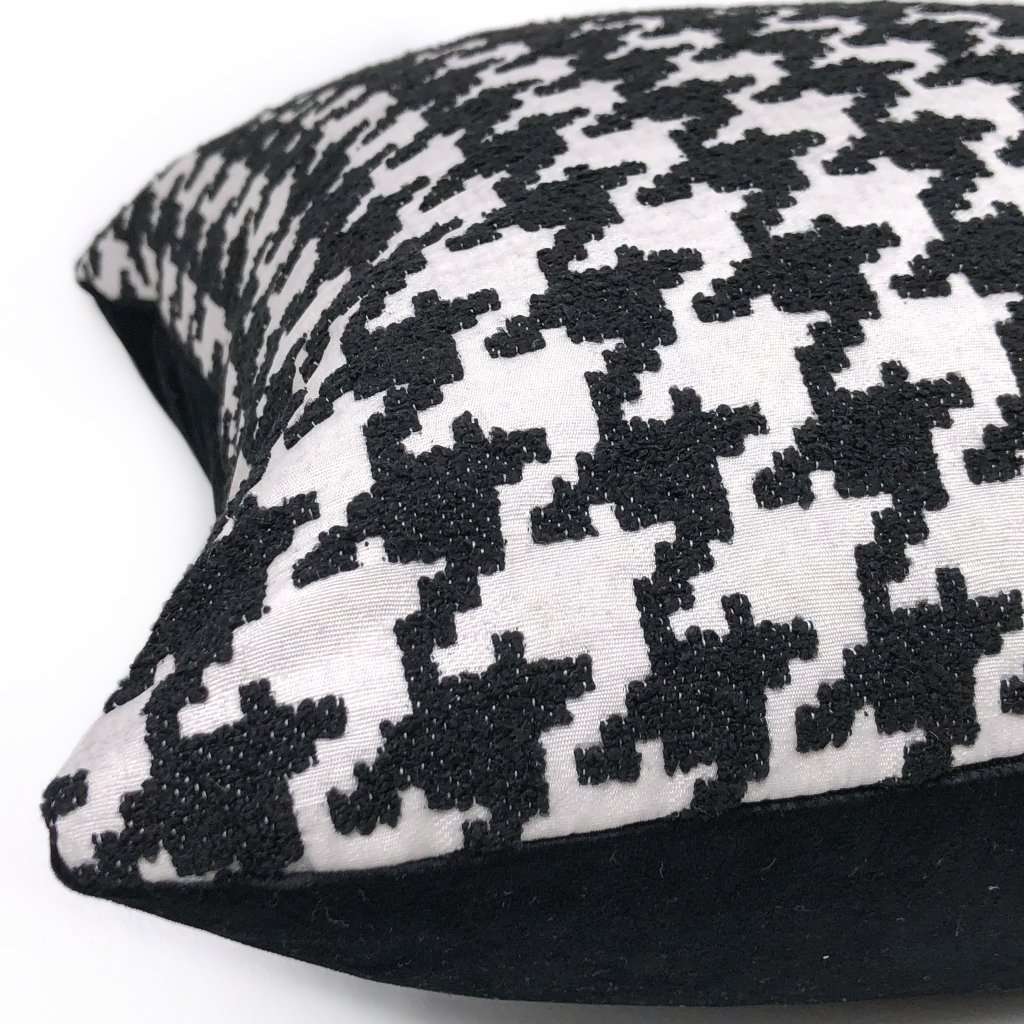The classic houndstooth pattern is a timeless constant in interior design and no wonder! Our Lyndon pillow executes the houndstooth in black and off-white, a color combination that goes with virtually everything. The black areas has a soft chenille texture; the off-white is plain woven and has a slight grayish undertone.