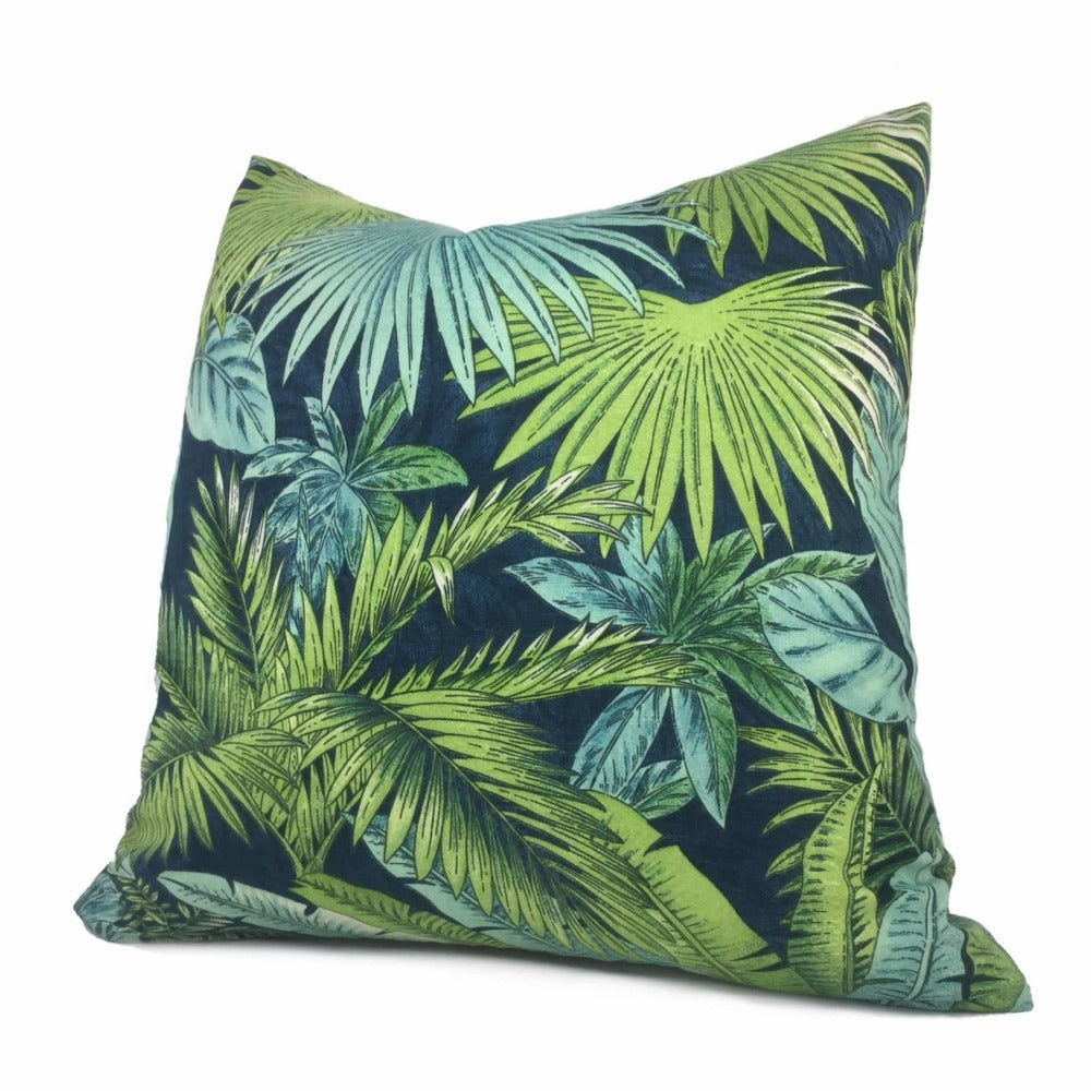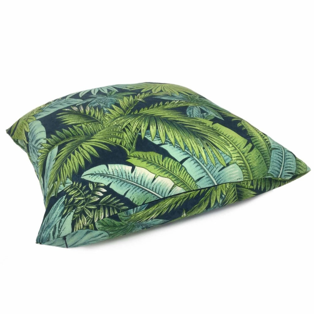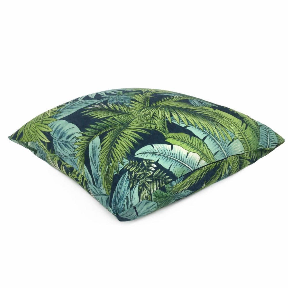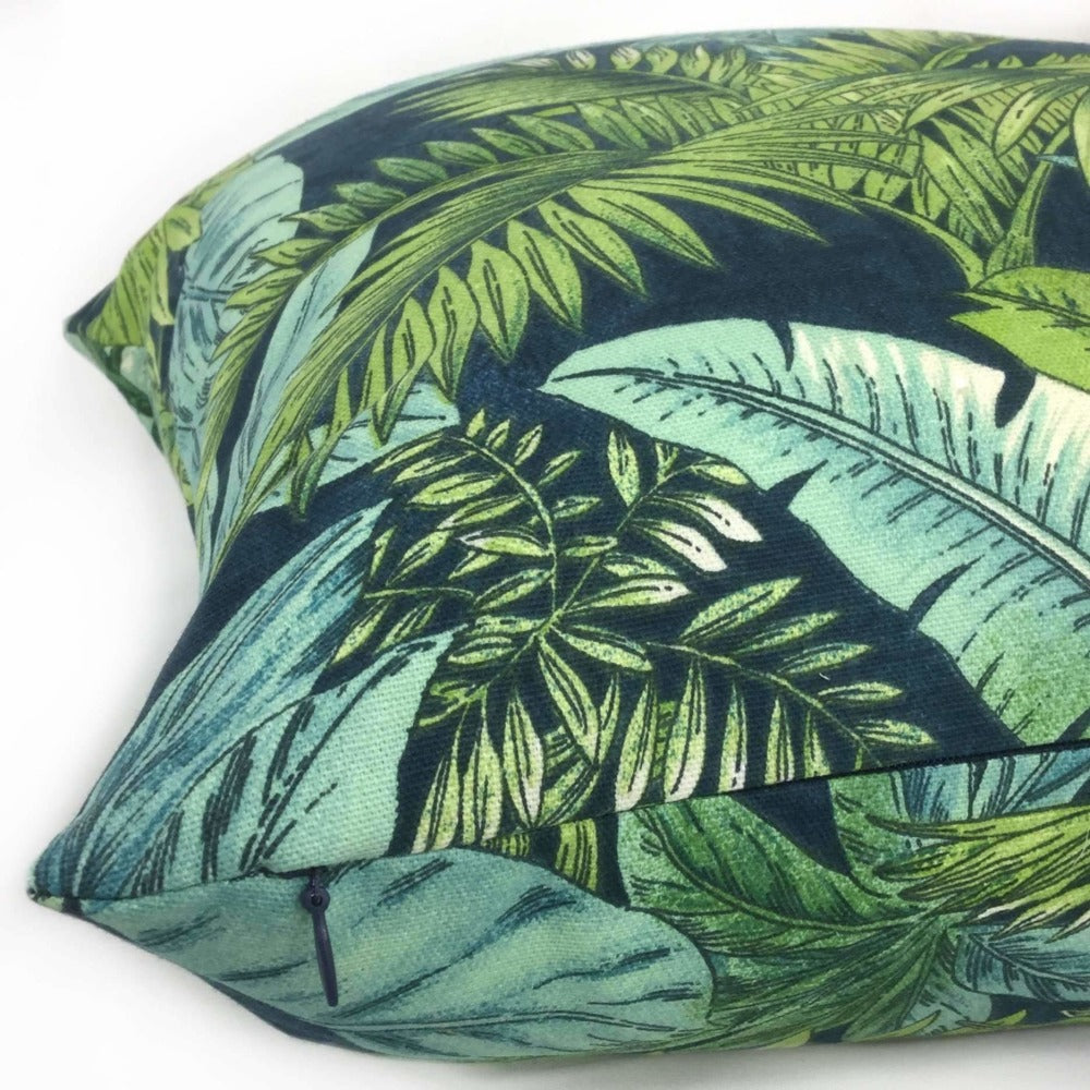Can you feel that Bahamian breeze blowing off the beach? Tropical palm fronds printed in multiple shades of green on a navy blue background make this botanical pillow cover the perfect choice for any casual home interior. Designer pattern cotton print fabric used on both sides.