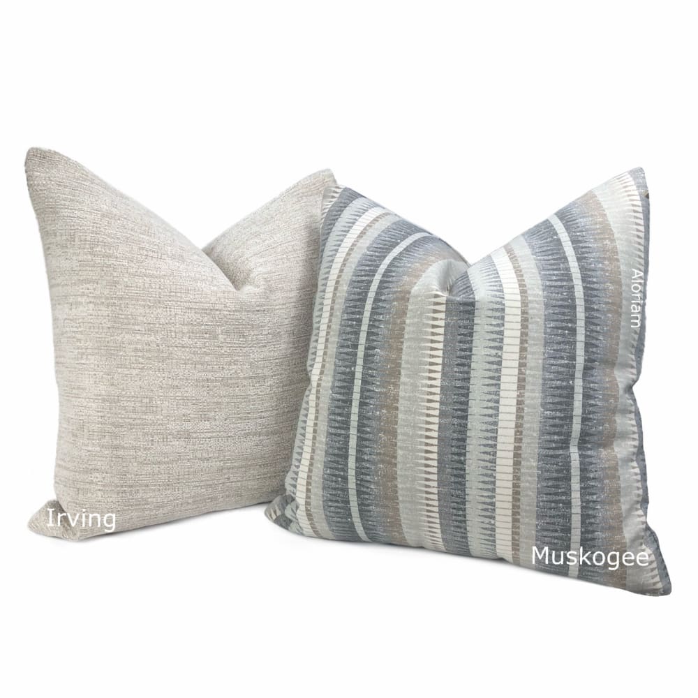 Last two! Irving is an oatmeal colored chenille pillow cover that has a textured fuzzy hand. The neutral color coordinates with many color schemes. Pattern upholstery fabric on both sides.