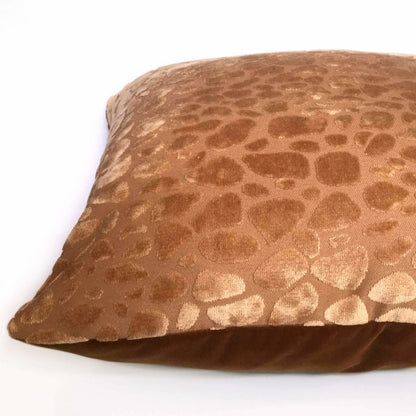 This adobe colored velvet pillow cover features a modernized animal spot or pebble pattern. The terracotta clay-like color is beautiful and warm! Photographed on 19x19 cover (filled with 20x20 insert).