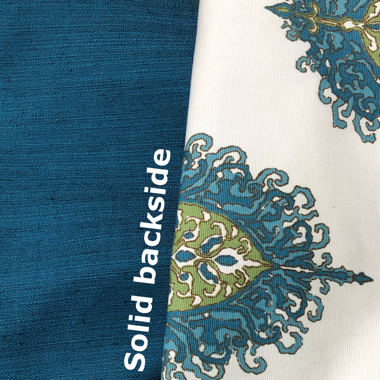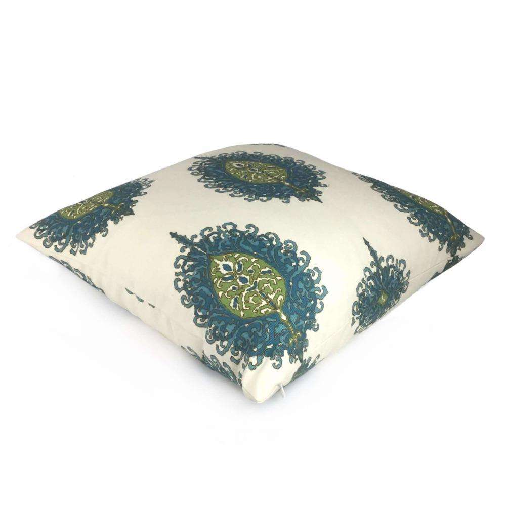 This pillow cover features an Alfred Shaheen design of a paisley style medallion printed in blue and olive green on a cream background.
