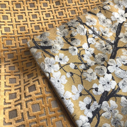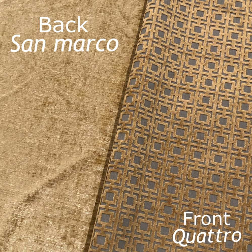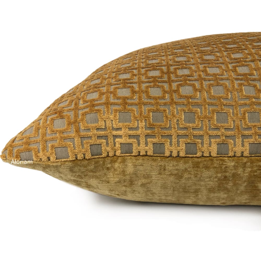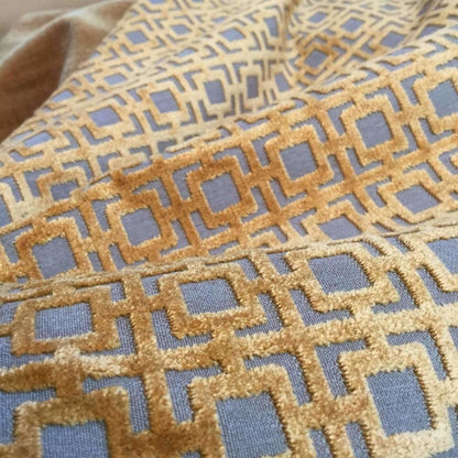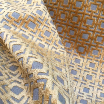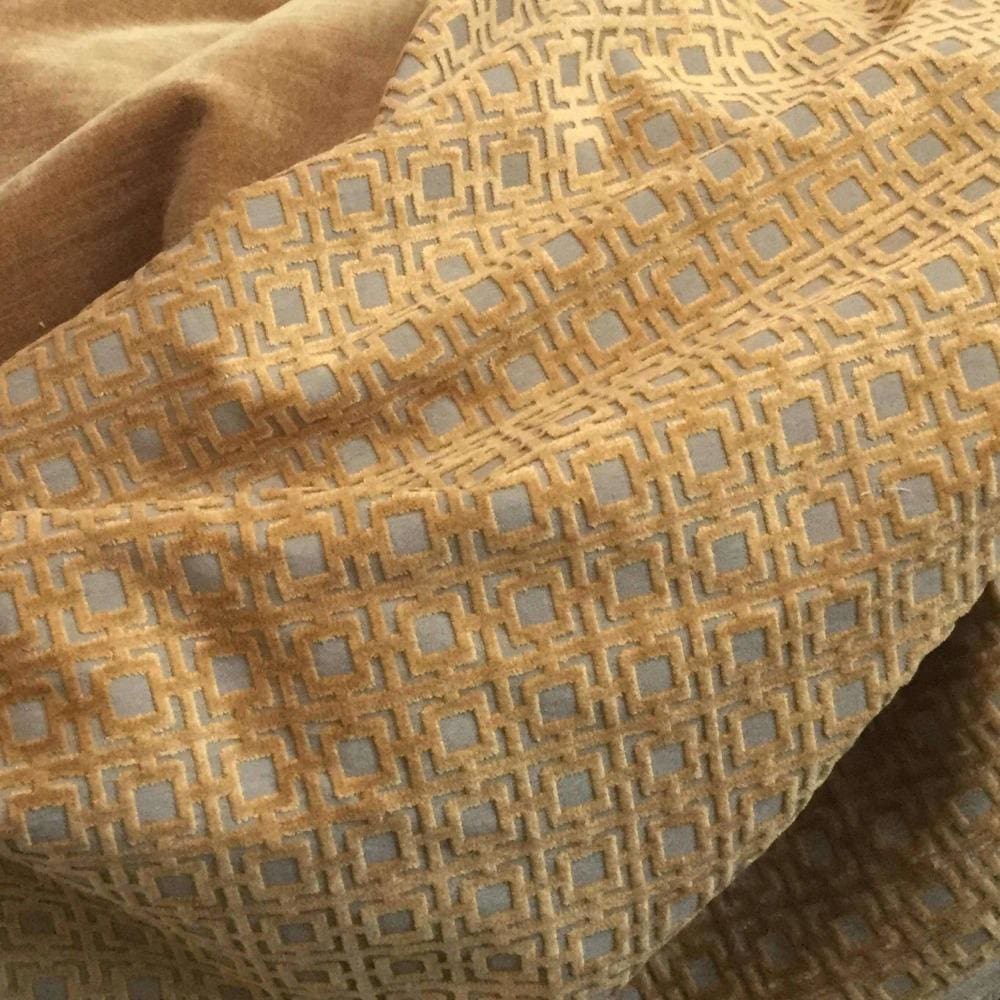 This drop dead gorgeous velvet designer fabric features a modern square lattice geometric pattern woven in a rich amber gold color. The solid backside fabric is the San Marco in gold (see photo 3).
