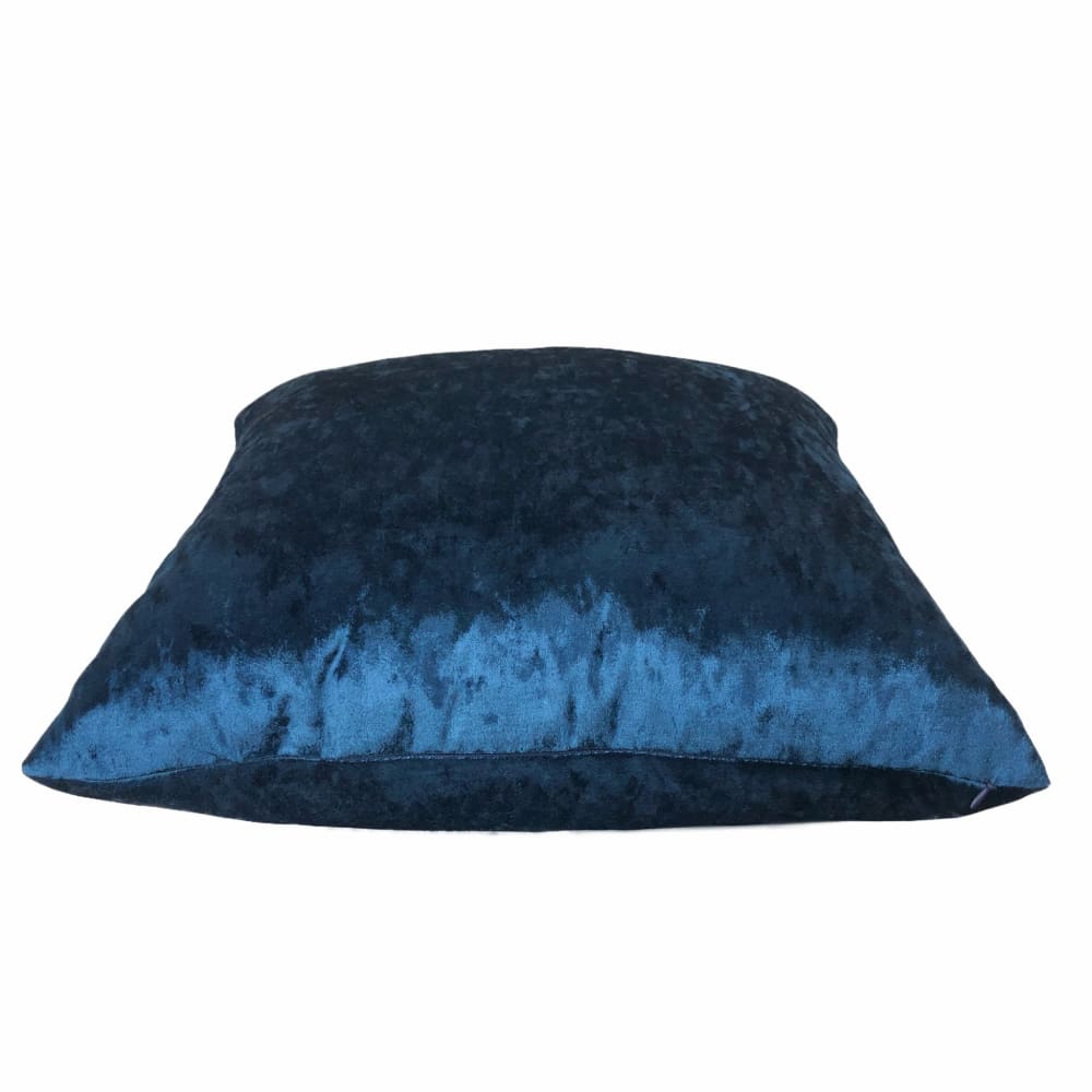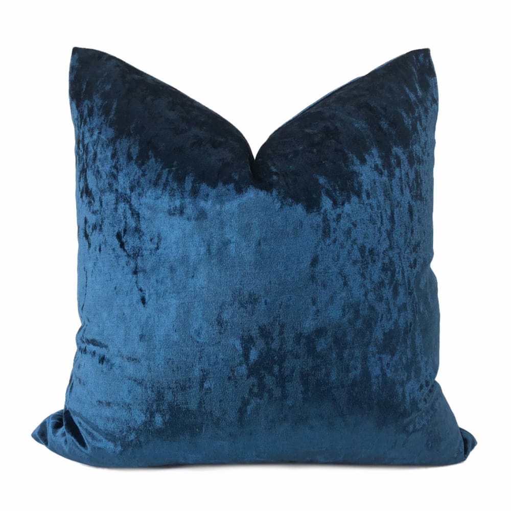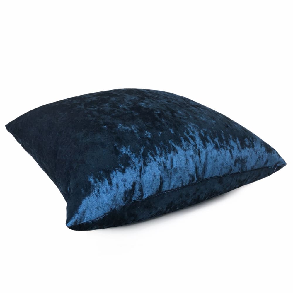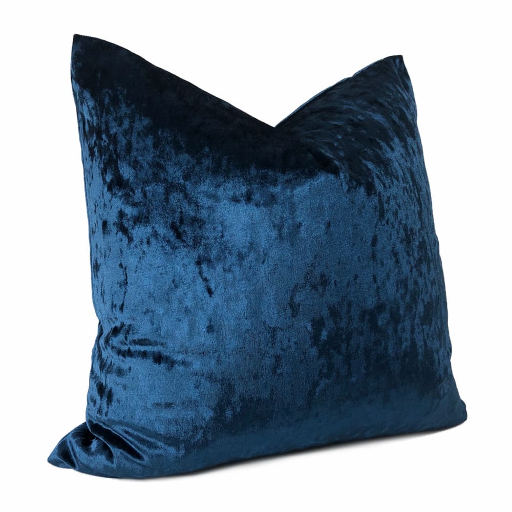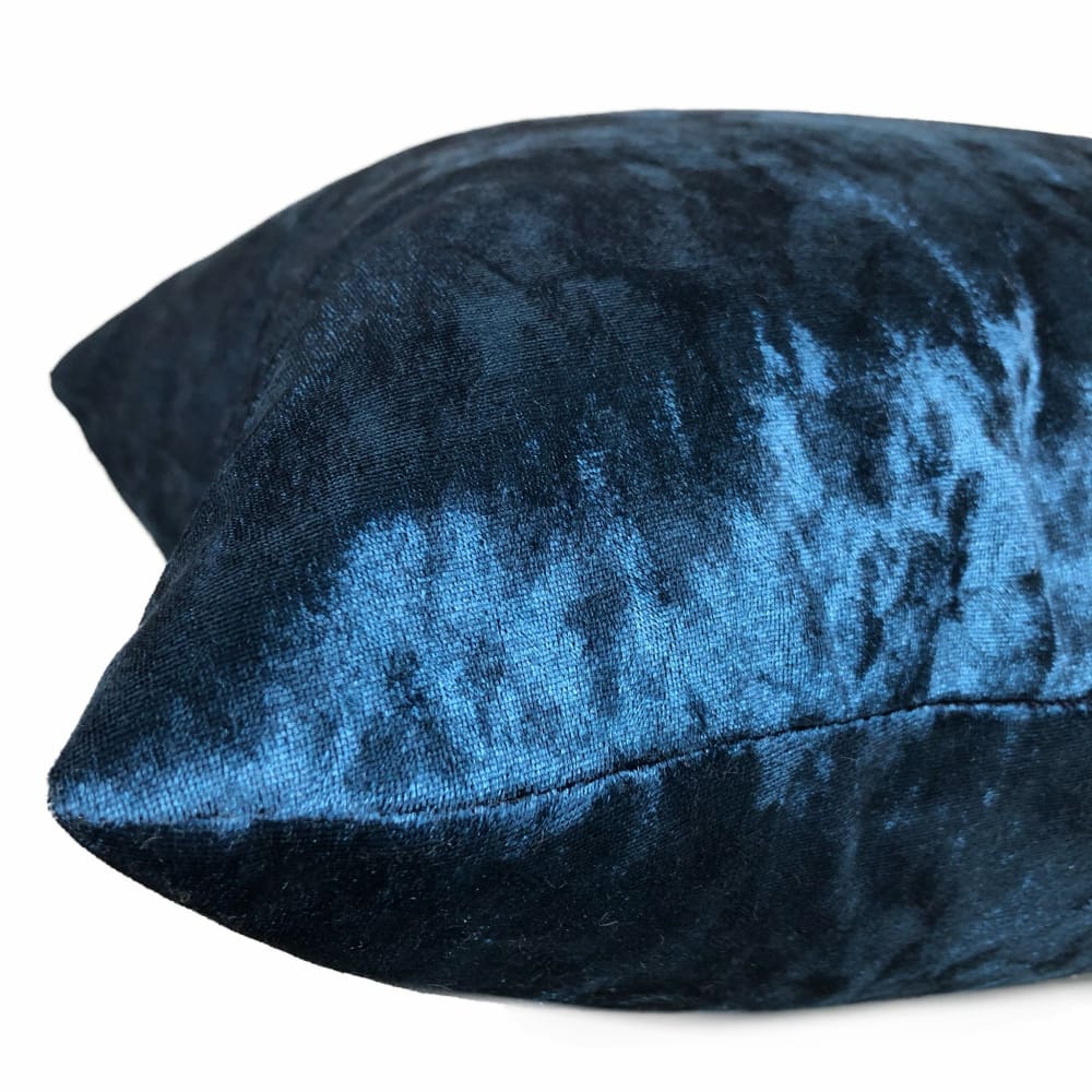 The Arcturo velvet pillow cover merges saturated sapphire blue color with tonal variations and brilliant shine. The soft polyester velvet is highly reflective, and the crushed velvet pile adds a light-and-dark dimension that elevates the Arcturo from just a simple dark blue velvet pillow to a design with hidden depths.