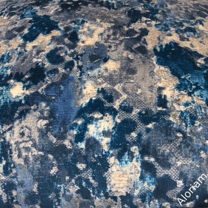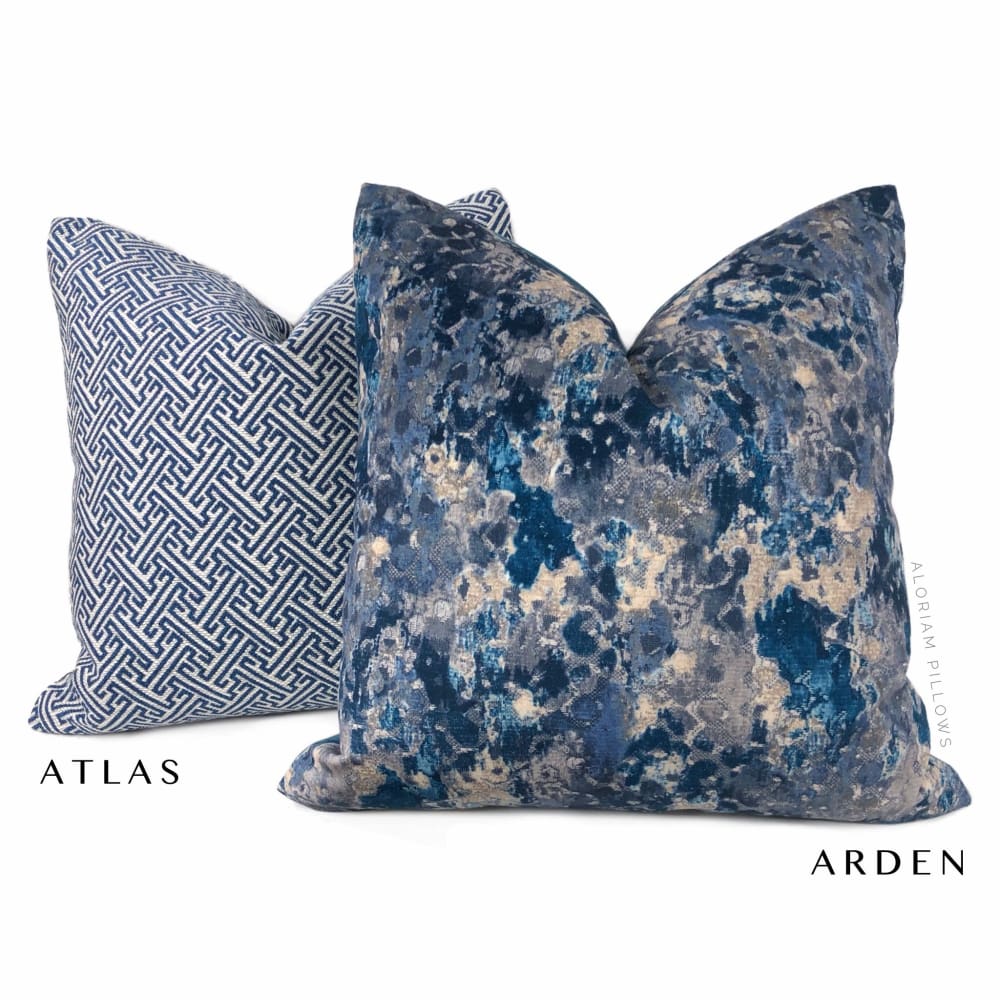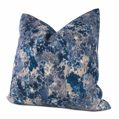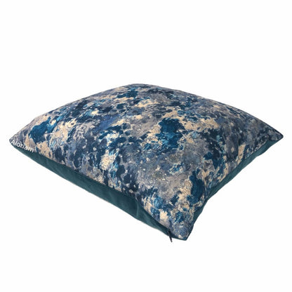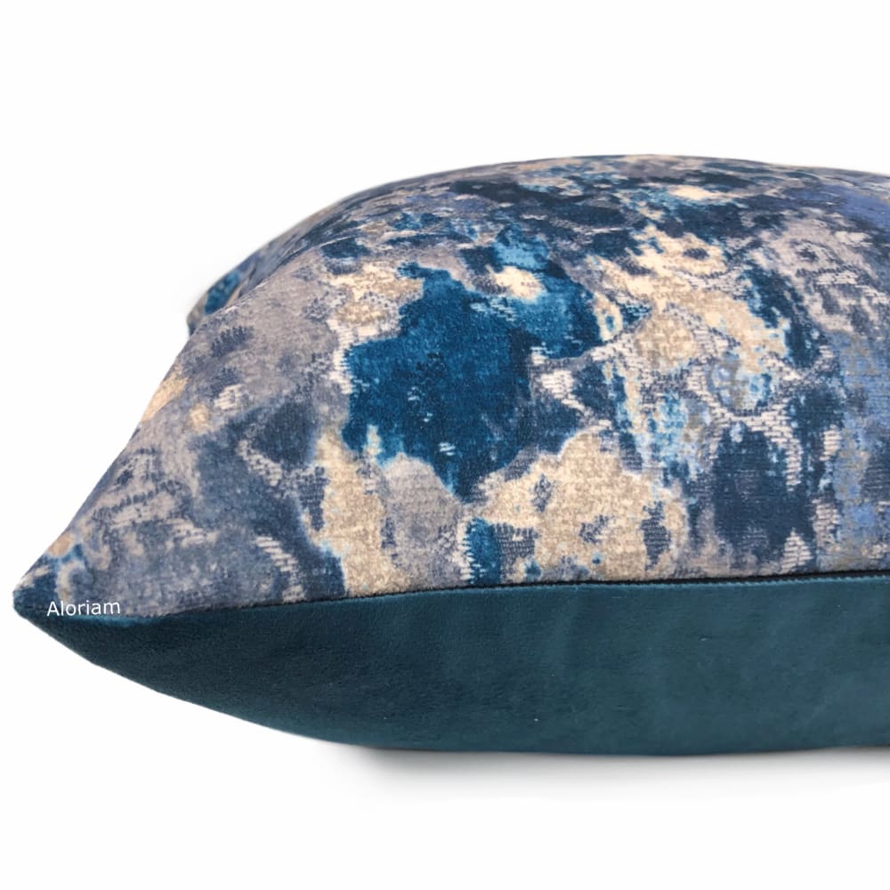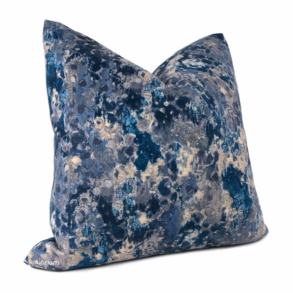 Arden is a polyester velvet pillow cover digitally printed with an abstract floral design in tones of blues and grays.