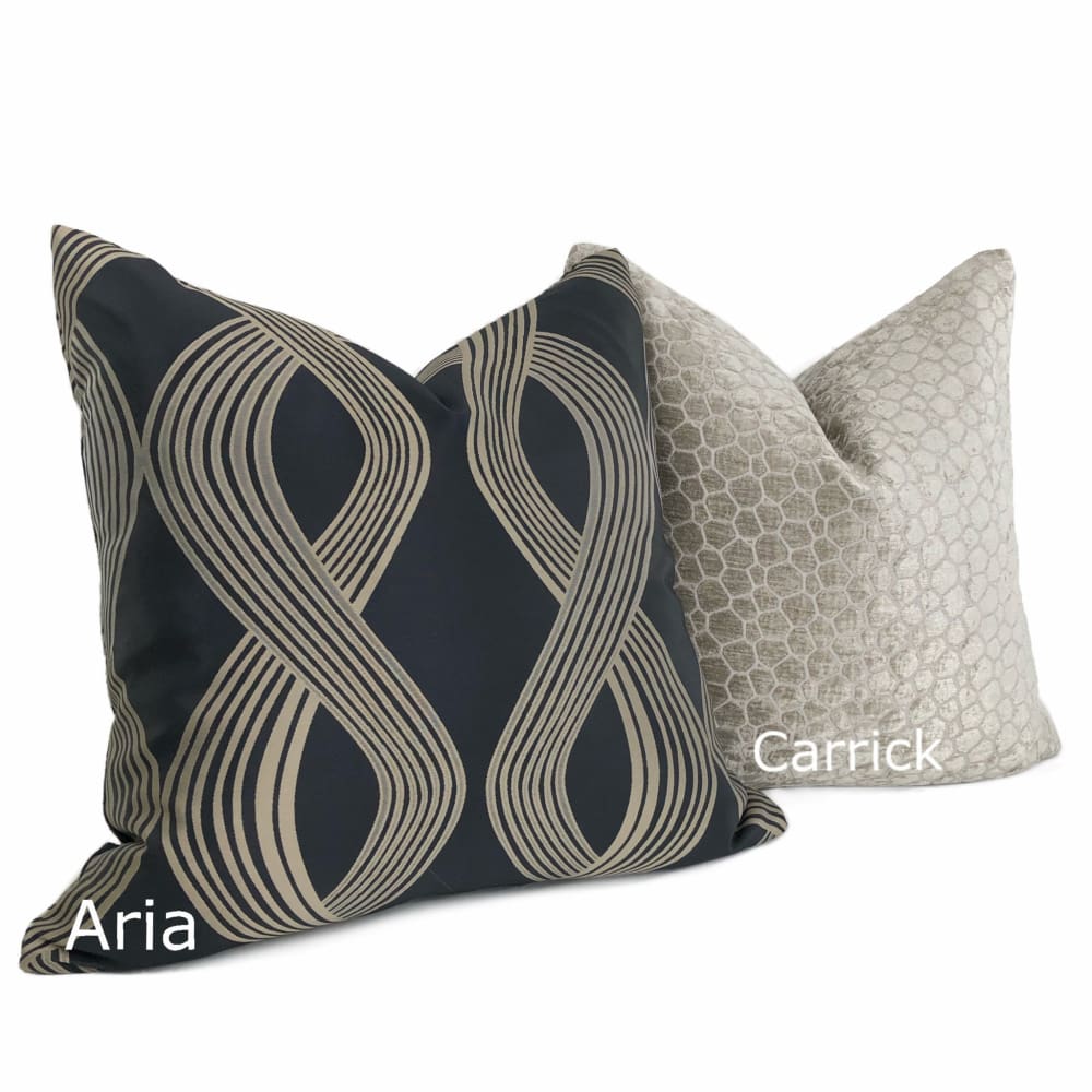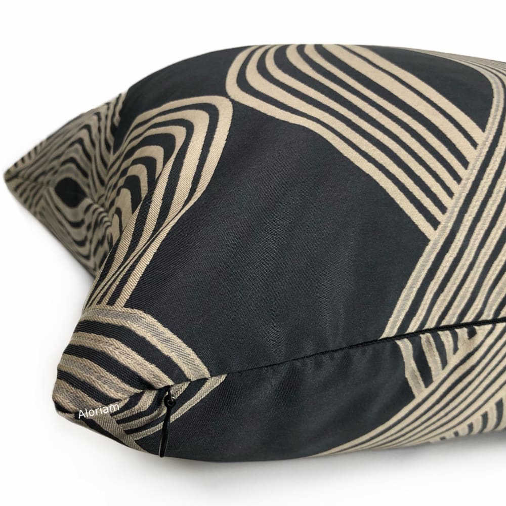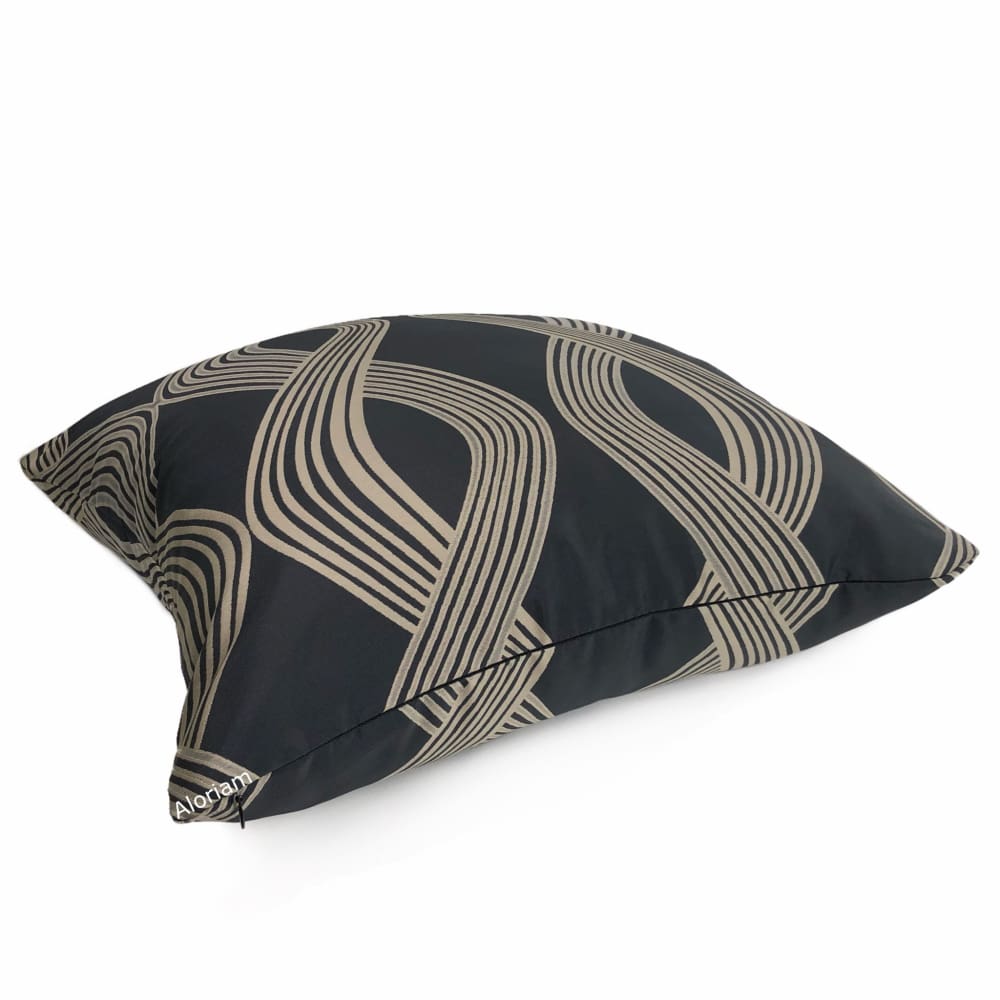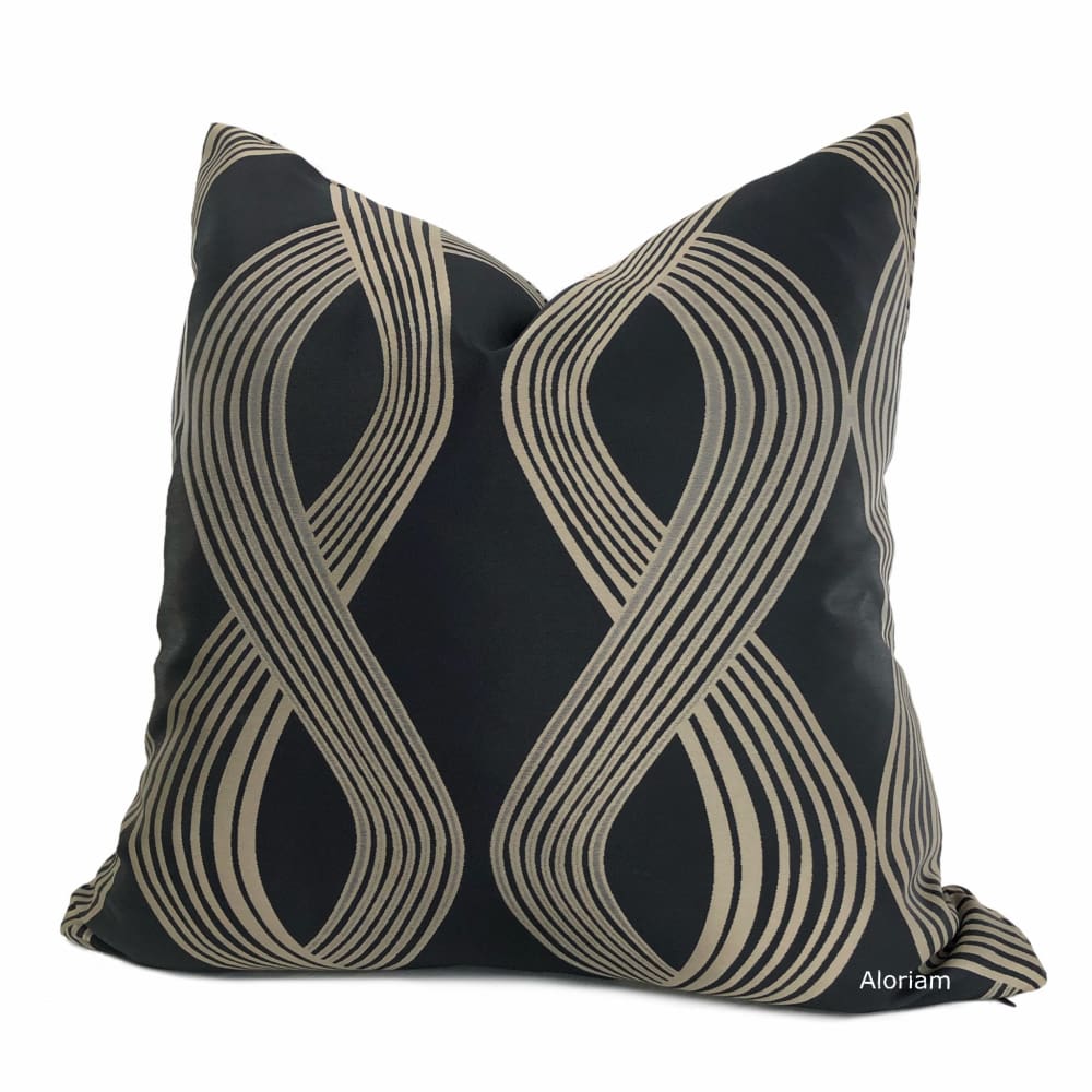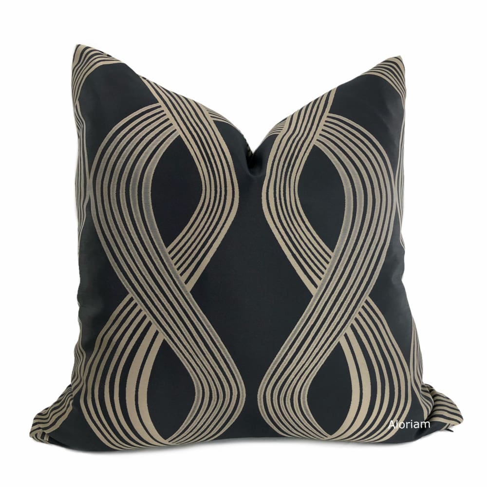 The Aria pillow cover features a captivating modern design of twisting ribbon stripes woven in bronze brown on a dark charcoal gray background. Pattern fabric is a lustrous jacquard woven drapery weight polyester fabric, and is used on both sides. Photographed on 20.5x20.5 cover (filled with 22x22 insert).