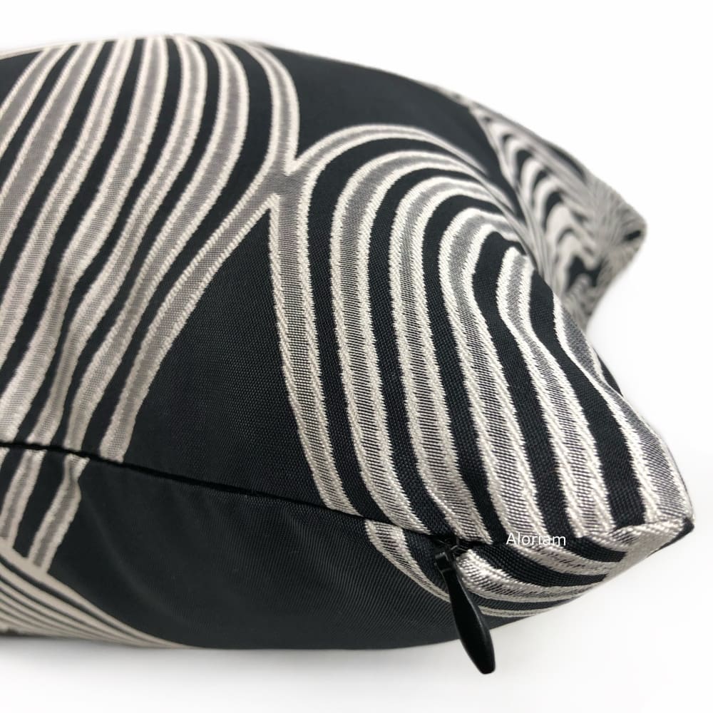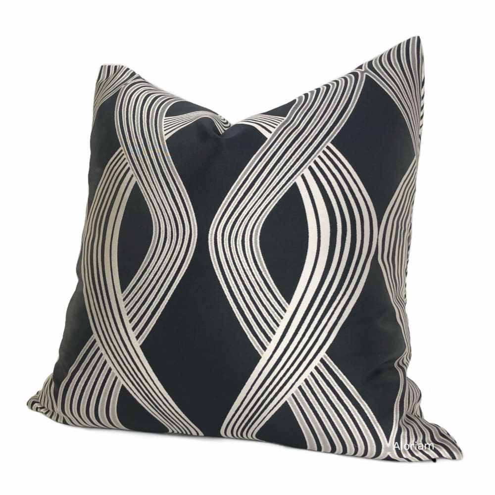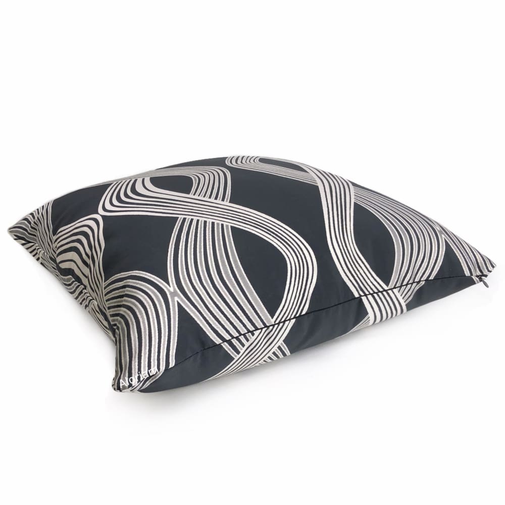 The Aria pillow cover features a captivating modern design of twisting ribbon stripes woven in silver gray on a dark charcoal gray background. Pattern fabric is a lustrous jacquard woven drapery weight polyester fabric, and is used on both sides. Photographed on 20.5x20.5 cover (filled with 22x22 insert).